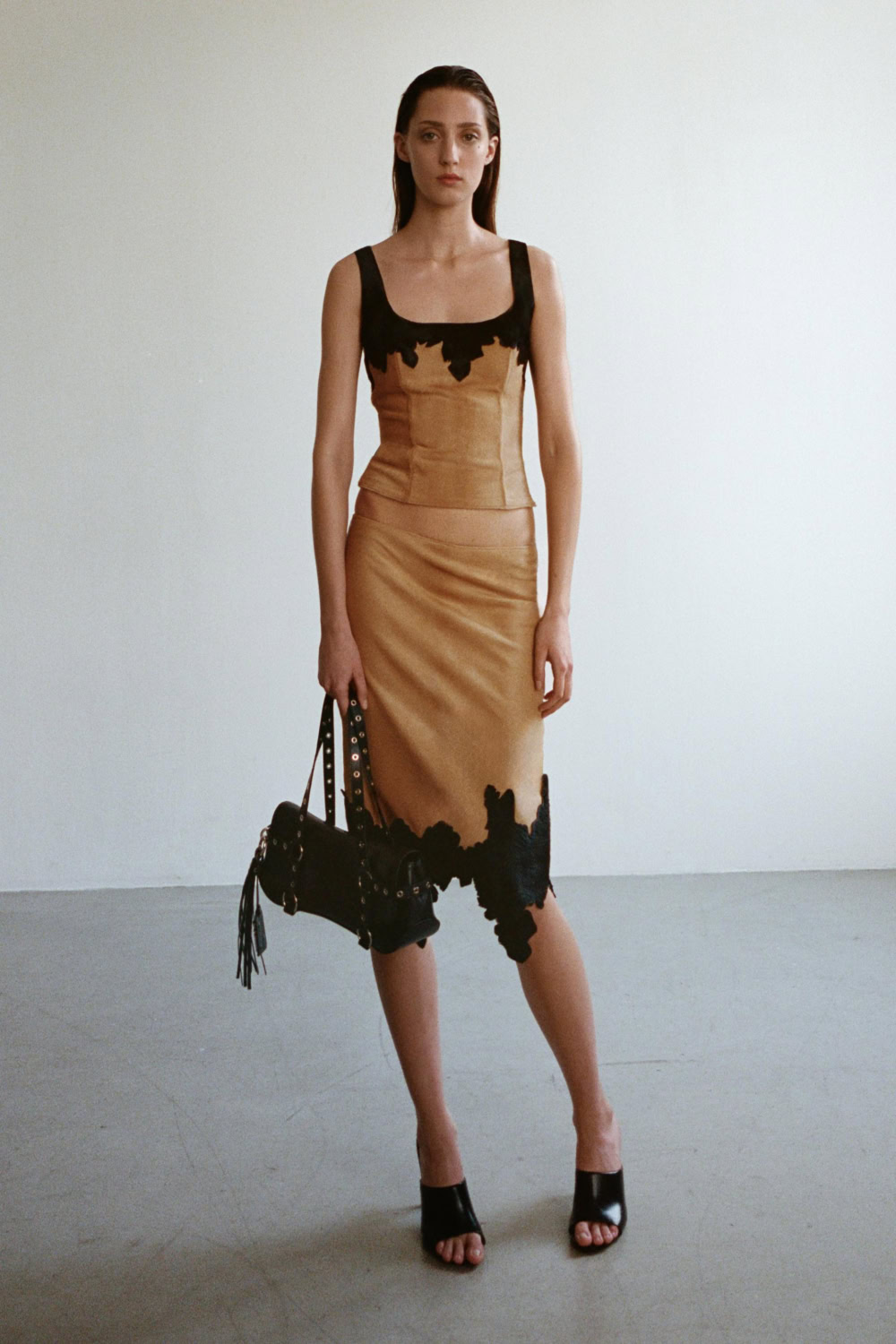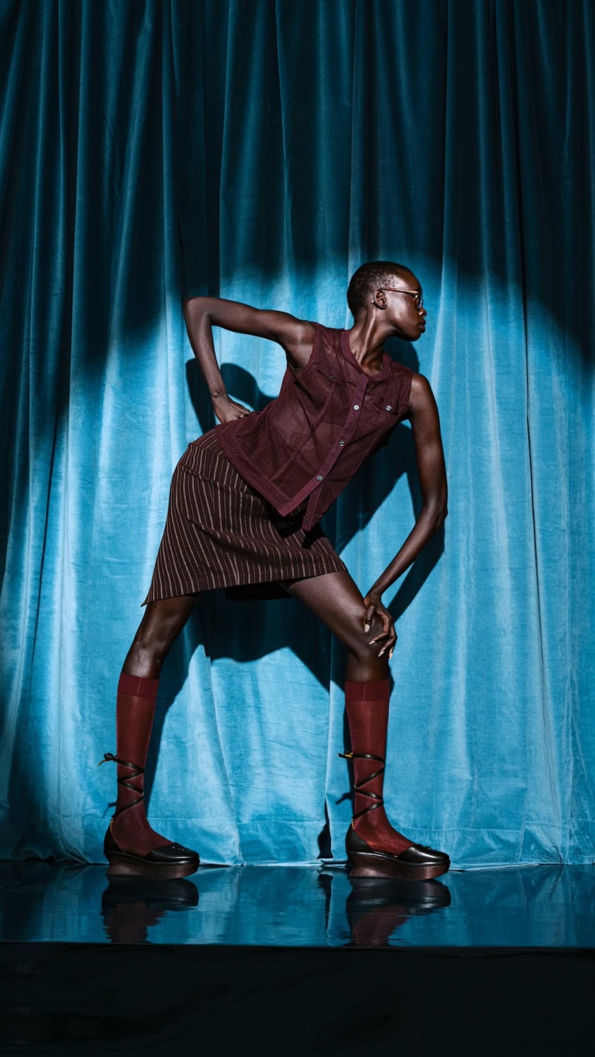 For AW26, Parisian designer Ludovic de Saint Sernin expands his universe into darker, more severe undertones. Materials of velvet, leather, lace and mesh soften the colour palette of black, white and red. A raw approach to design, de Saint Sernin rejects the idea of spectacle. More, but make it meaningful, and not in excess. Featured accessories include the maison’s signature Cleavage bag – now available as a clutch and bucket bag, as well as the original baguette style. In black nappa leather, black, red and white patent leather, beige suede and black pony leather. The harness bag makes its debut amongst the collection – in a baguette style suspended from a harness, with subtle references to bondage.
