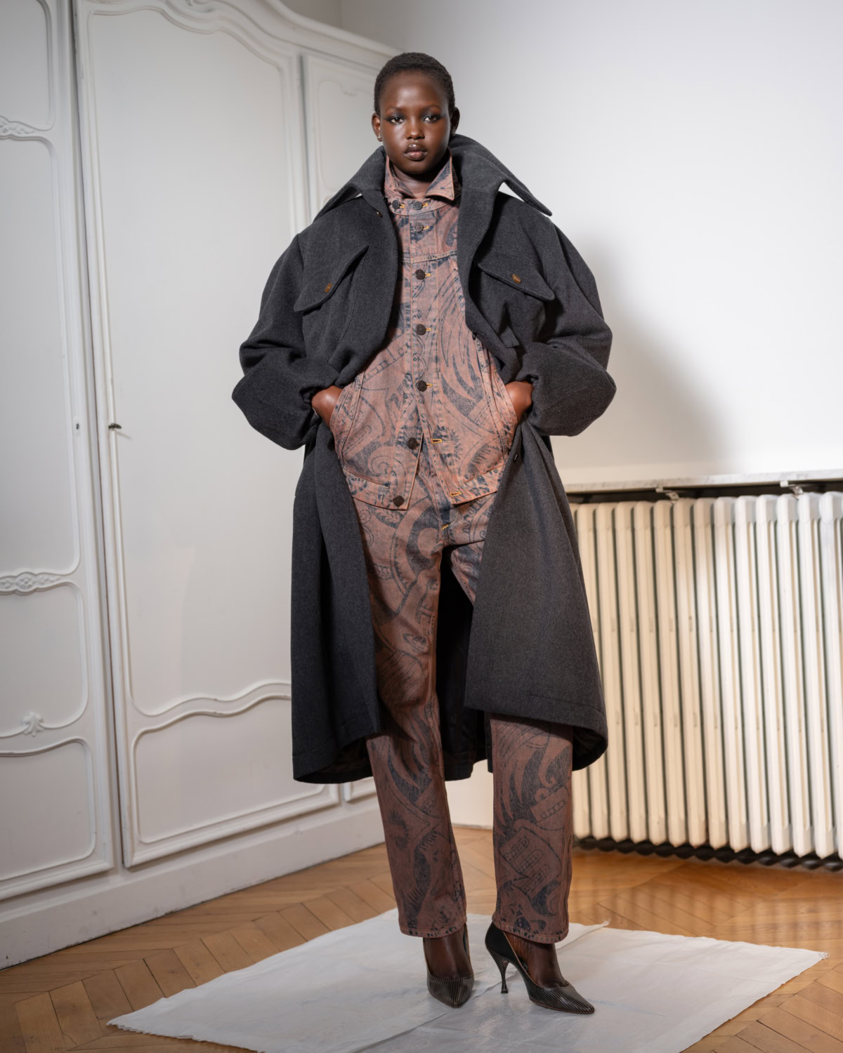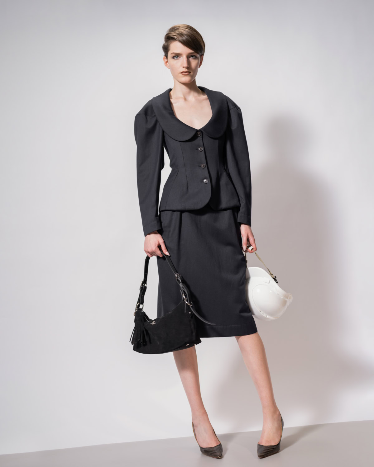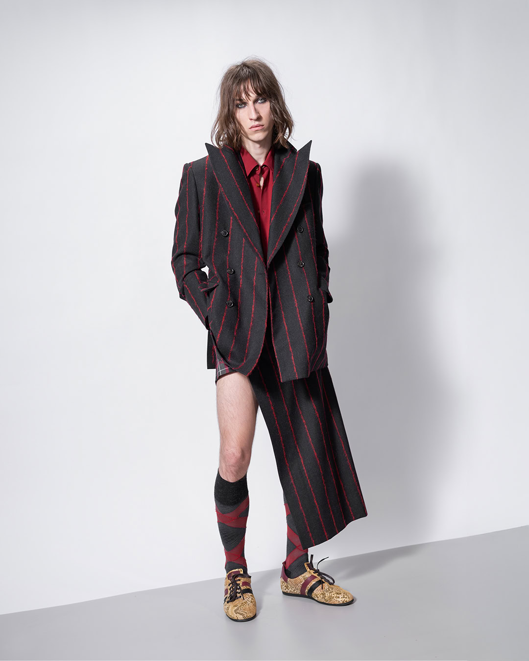 Spectacle, narration, performance – Vivienne Westwood’s latest assemblage has it all. Directly inspired by England’s history, open sleeves and corseted knitwear as seen in Hans Holbein’s Tudor court paintings, are reimagined in VW’s portrait of its own modern England.  Hunting breeches and felted tailoring meet mini skirts and fishnets whilst billowing melton overcoats conceal draped lurex party dresses. Stripes and oxford shirtings are reminiscent of the 1994 Café Society collection. A recurring sly erotic undertone features – through stockings and suspenders, taken from the Andreas Kronthaler for VW Paris show.