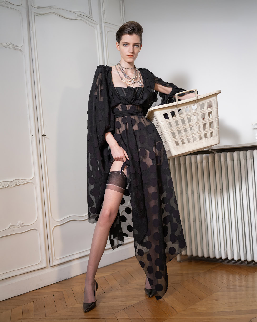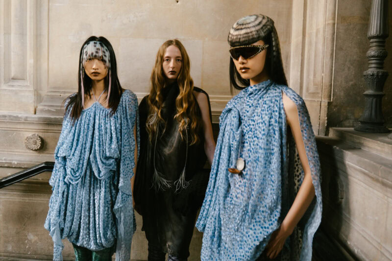 The supporting lookbook, shot by Suffo Moncloa, is reflective of the 14th century medieval anthology Canterbury Tales – the models playing as characters sprawled doing everyday tasks, each look balancing exaggerated asymmetric tailoring with a barely-there gauzy air.