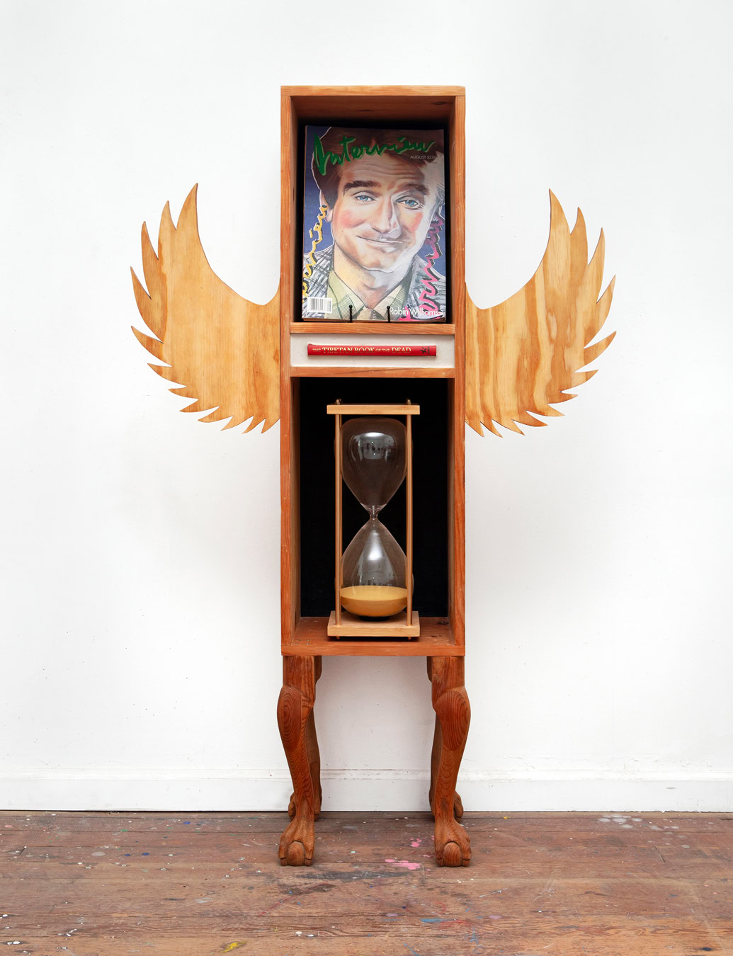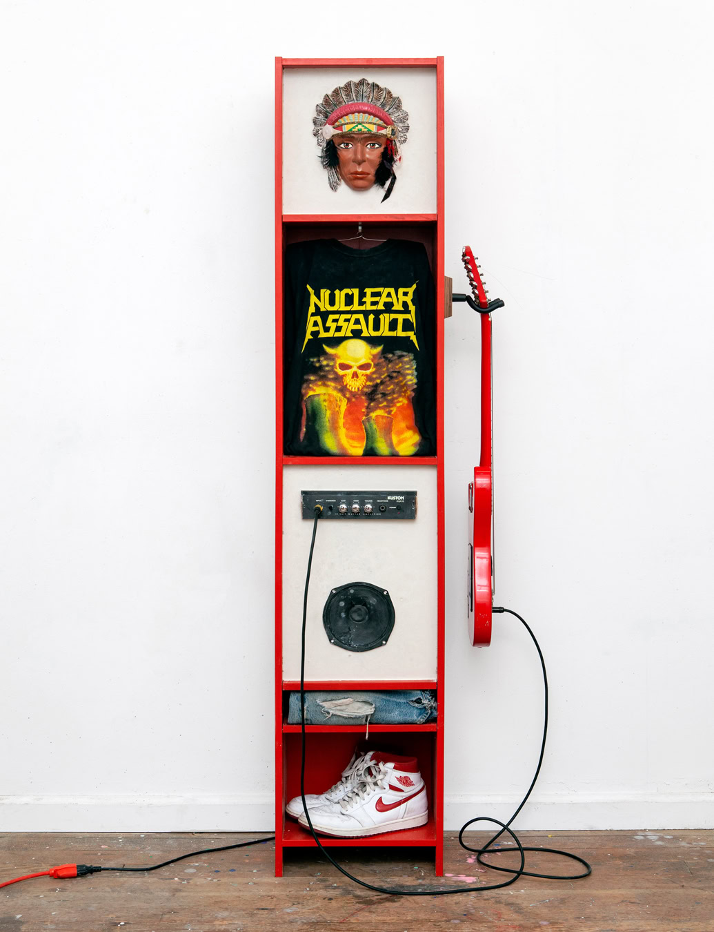 from left: Justin Guthrie’s ‘Purgatory’ cabinet, 2025 and Guthrie’s ‘Rez Metal Spirit’ cabinet, 2025