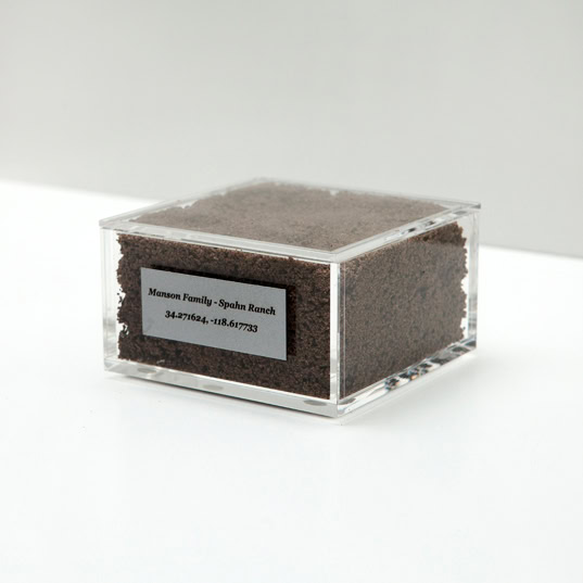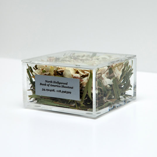 Justin Guthrie’s work is a challenge to describe. It sits in a liminal space and he calls it “a kind of pop cultural anthropology”. His most recent body of work, Psychic States, consists of plexiglass boxes filled with soil, plants, rocks and fragments from locations across Los Angeles, where moments happened, both real and imagined. There are 12 locations in total, including that of cult leader Jim Jones’s People’s Temple at 1366 South Alvarado Street; the site where James Dean died in a car crash; and the fictional Winkie’s Diner from the Trash Man scene in David Lynch’s Mulholland Dr., at 1016 West El Segundo Boulevard. Guthrie told me, “I think it’s been this weird obsession with trying to find the mystic and the mythic in everything.” He grew up in a mixed-heritage household in New Mexico. His mother is Navajo, with her culture’s spirituality and ceremonies interwoven into daily life, and he has Scottish and Cherokee heritage on his dad’s side. His work has a magic distilled in it, as he sees it where others might not. “James Dean is a mythic figure of youth. Where he died there are flowers and memorials. People treat him almost as a neo pagan god of youth,” he says. Since high school he has been concerned with how to straddle two worlds: the American pop cultural contemporary and ancient Indigenous philosophies and rituals. With his book New World Rites (2021), he made a series of photographs that wrestled totems and signs from the spiritual world into American suburban landscapes and backdrops. Today, especially in the US, there is so much that has been erased and forgotten, replaced with a metropolitan cosmopolitanism, but all cultures were once imbued with folkloric and ritualistic tradition. Guthrie’s work reminds us of that. After speaking with him I notice that I look at signs and symbols a little differently, curious about what their deeper meanings could be.