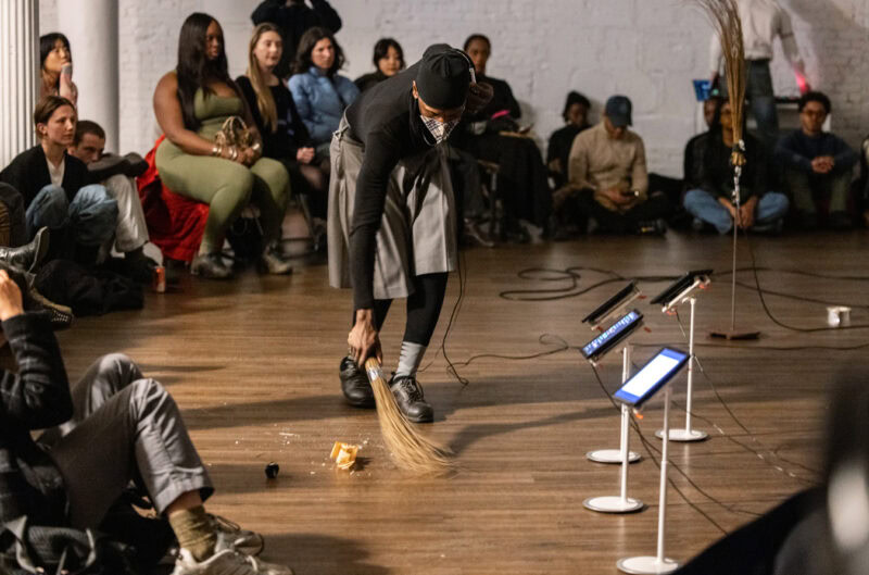 “I make sculptures that usually have a sound element, usually a found element, and I often have to activate through some sort of action,” chukwumaa says. “They take one form, I perform with them, then they take another.” For a work they performed at the Studio Museum in Harlem in 2020, chukwumaa swept the floor from one end of the space to the other, gathering all the debris and detritus as they went, a sculpture that resembled the palm frond brooms used in Nigeria where they grew up. The phenomenological element moved a member of the audience, who remembered their grandmother doing the same. The best work always brings you somewhere emotionally unknown. In another work performed in Union Square, they mapped out the points where the Bluetooth signal from a nearby phone dropped out. “Sound is quite literally a physical and material thing, so it’s something you can sculpt and think about spatially,” they tell me. They describe their work as soft sculptures about liminal characters, Nigerian Igbo trickster myths and non-linear narratives. Tricksters like Anansi from Ghanaian culture and Ekwensu from Igbo culture permeate the work. “Ekwensu was not an arch deity; he is part of the pantheon of many deities and was not anything you could compare to the devil. The devil was objectively trying to make bad things happen whereas Ekwensu presents moments of destabilisation,” they say. I begin to think about chukwumaa as a modern-day trickster, their work presenting these moments of destabilisation for us to think about and reconsider the world around us. I put this to them, but they laugh it off, saying that, “instability is really important to the work I make”.
