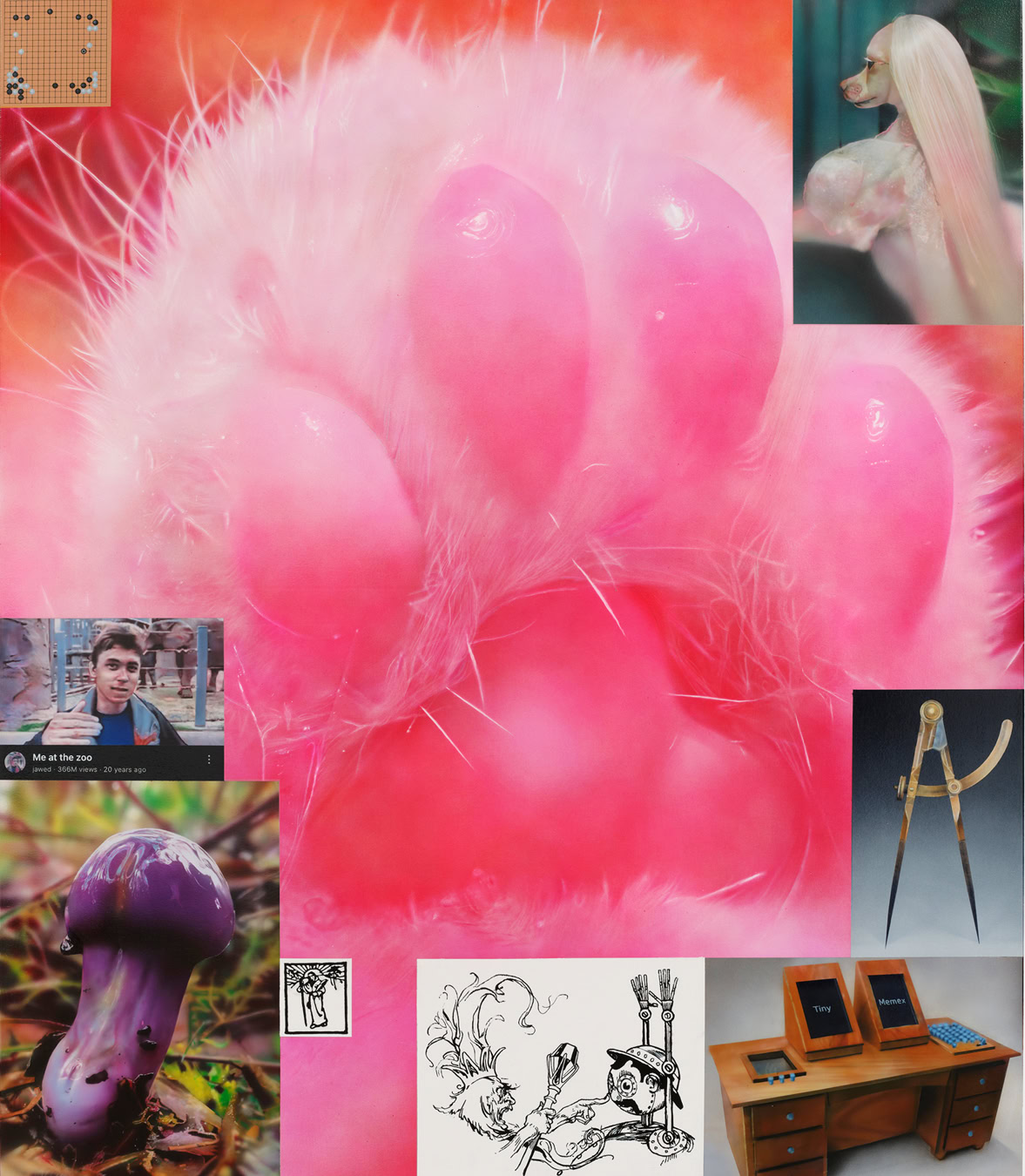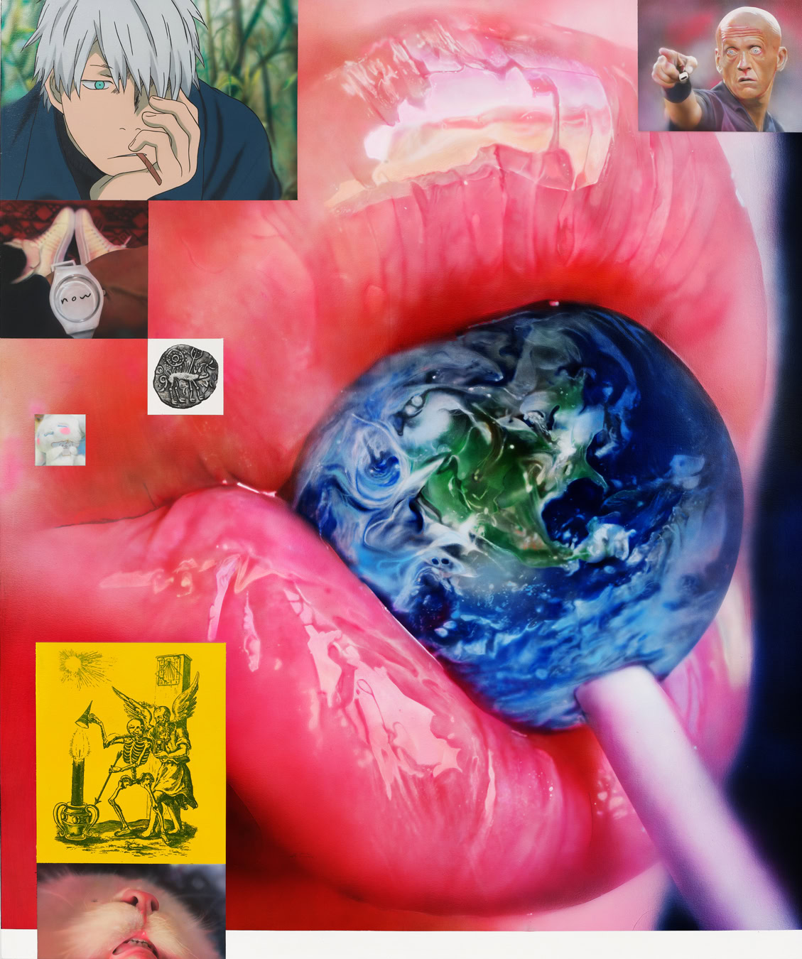 A fluffy white cat alongside hands grasping to pick it up is painted meticulously. With the words ‘Pain Lord’ written across the top and ‘In the end, pain is only pain’ at the bottom, it takes on an almost sinister presence. A woman in a G-string with a tattoo at the base of her spine reads a book, as a bald figure, an Iain Banks novel, a severed head and a CD are strewn around her. A black-and-white image of a woman and a muscly Pooh bear in a tank top frame the scene with a mythical kingdom in the distance. ‘Bloodflow’ is written in gold across the bottom. Craig Boagey’s intricate large-scale paintings are like fever dreams. When I asked him if they are intended to unnerve he said, “The paintings operate more as a visual bombardment – [they have] dense, layered fields of information. They may have the ability to unnerve, but that isn’t my primary goal.” Using imagery he finds online, it is uncanny to see the deluge we doomscroll through painted with such skill and craftsmanship. With his work, he says, he hopes to develop “a visual language that mirrors the cognitive conditions we operate under on a daily basis. We live in a state of continuous sensory influx and our perceptual systems are constantly filtering, discarding and reorganising vast amounts of information in order to maintain a sense of coherence.” This is what interests him and, using painting as a medium, he describes it as a “more concentrated form of attention” that invites a more engaged level of scrutiny. He adds, “Rendering [the work] with a somewhat high technical sufficiency, I like to think it removes any sense of disposability associated with such content.” The result is unsettling, as you begin to think deeply and uneasily about what we are consuming and the impact it might be having on us.