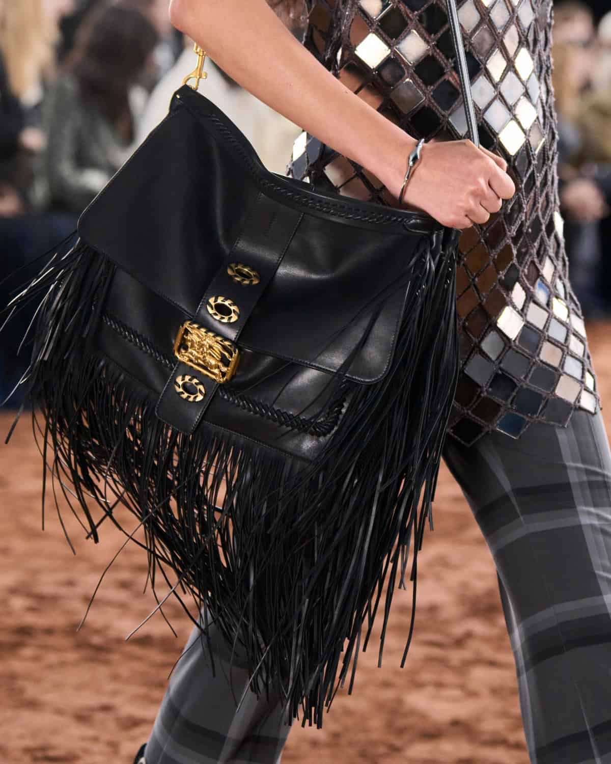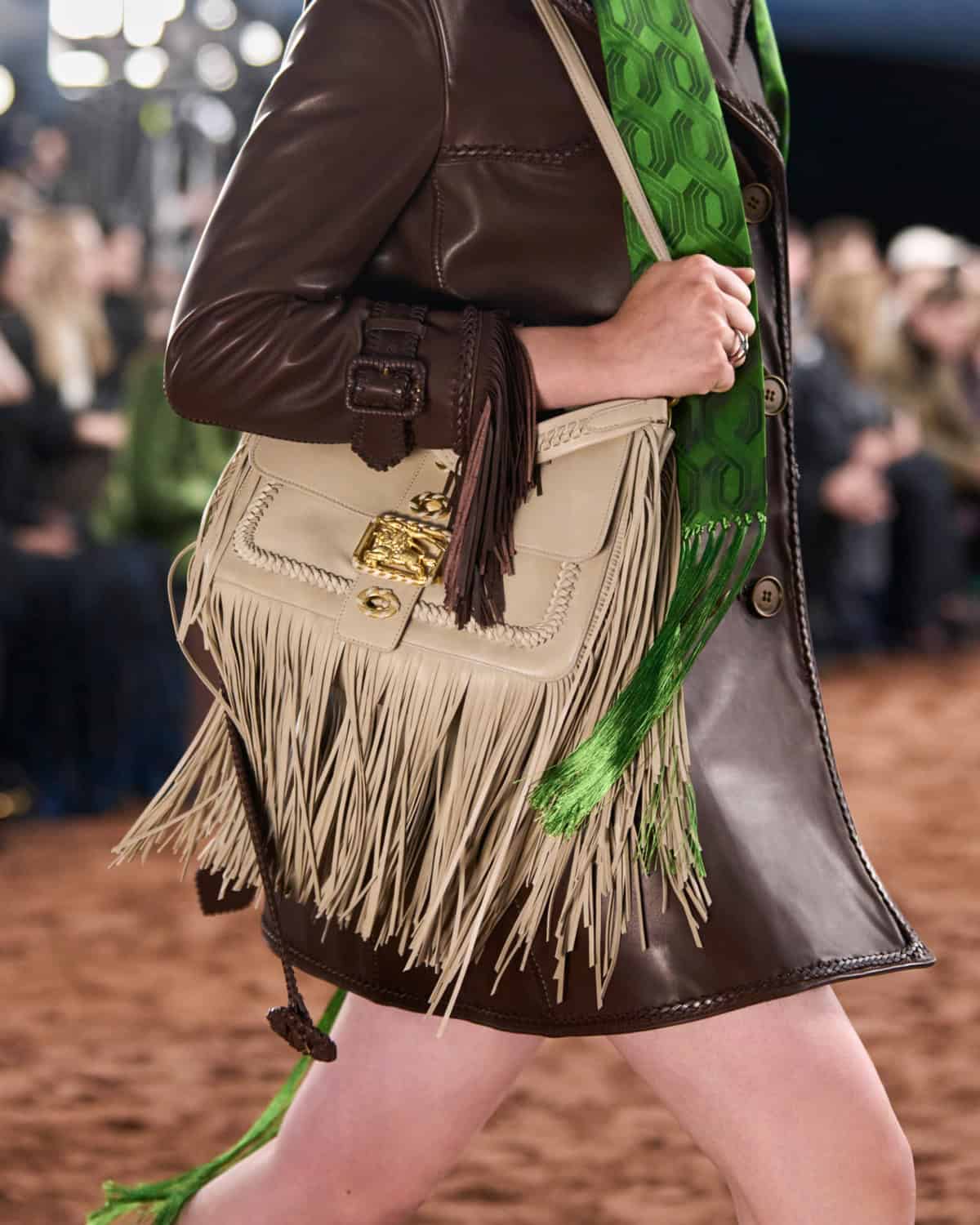 Crafted in Italy, the bag is delicate in structure and holds itself with a certain rugged elegance thanks to its small and medium sizes. It’s available in two variations – one with cascading fringing down the sides, one without – all completed in the whipstitched manner which provided the runway its Britpop-ish, rock ‘n’ roll edge. Don’t get it twisted though, the Rider suits you just as much on a waltz around the city as it does on the dry, trampled field. This versatile elegance is emphasised through its carriage, featuring both a leather top handle that can dangle from your fingertips and a detachable strap that allows the bag to perch sensibly on your hip.
