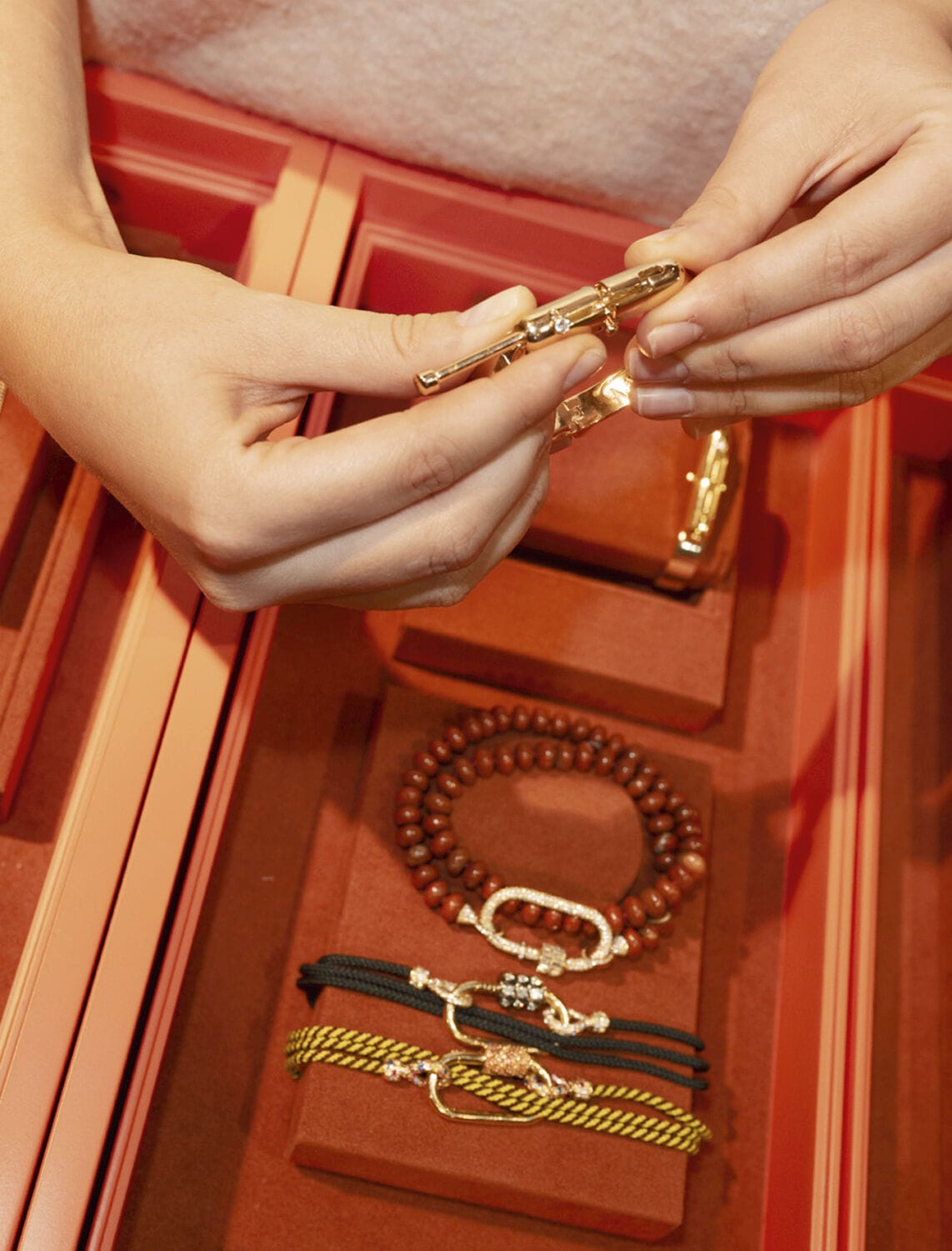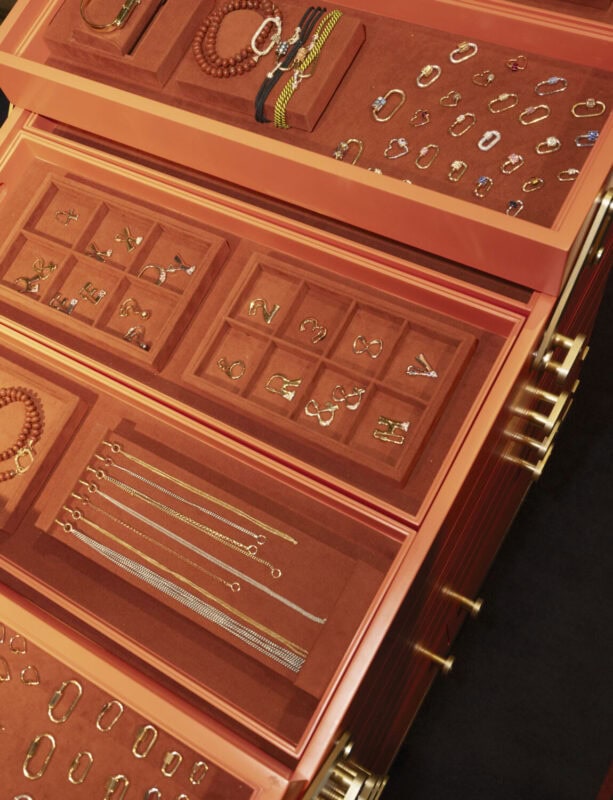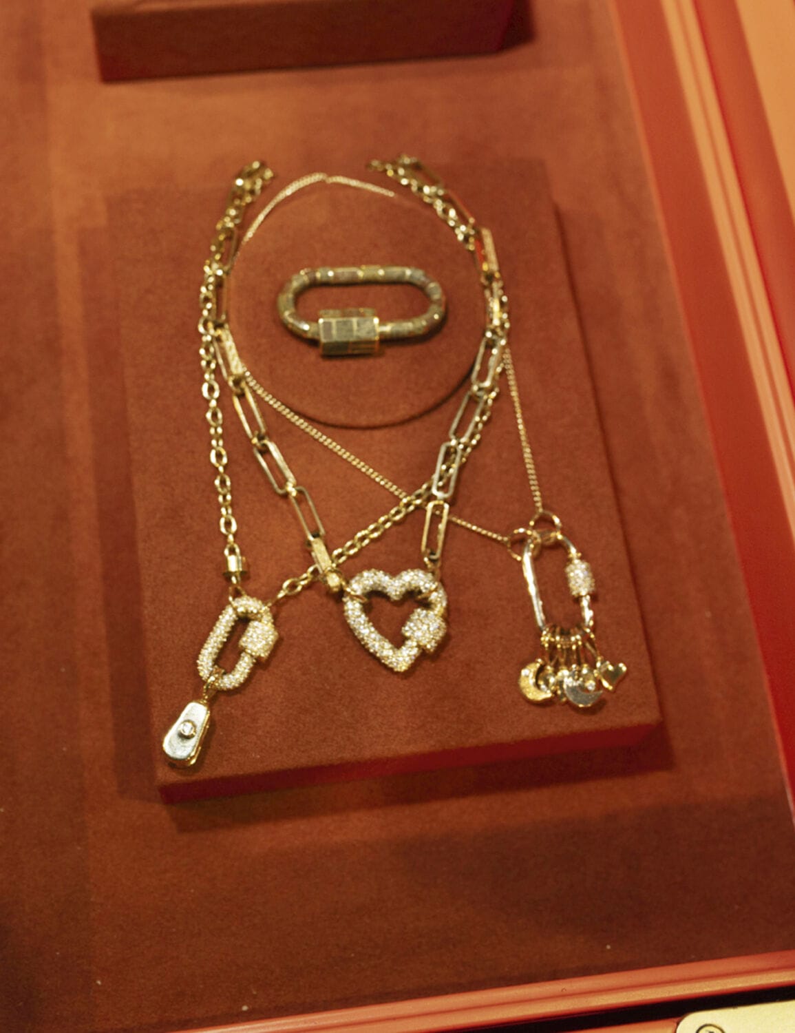 Aaron thinks brands don’t always understand how we buy jewellery. “People don’t come into wearing jewellery to [get] a whole look. That’s not how people wear anything. It’s a little bit of this and a little bit of that.” There’s not a single piece in her collections that’s meant to be one-dimensional or worn in a specific way. Flexibility and changeability are built in to her designs. Elasticated strands, sold as Thingys, resembling hairbands can extend necklaces and chains can be linked together to make long, layered pieces. Aaron demonstrates this by turning her gold Trundle bracelet into a choker necklace using an orange Thingy. Chains are even sold without clasps, so wearers can layer and link them with multiple locks. The Fiddling Series includes tactile pieces designed to be touched and moved, including the organic, serpentine Myriad lock, which looks like an interlocking infinity symbol. Its unique mechanism originated from a drawing that took her team more than two years to perfect, evolving from the Pushmipullyu pendant. Aaron creates yet another aha movement when she shows me how each side of the Myriad lock springs open.