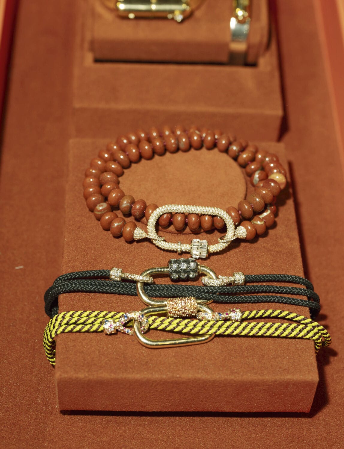 In her Liberty display case: clockwise from top left: locks, necklaces and bracelets in 14k yellow gold, 14k rose gold, 14k white gold, platinum and diamonds by Marla Aaron
