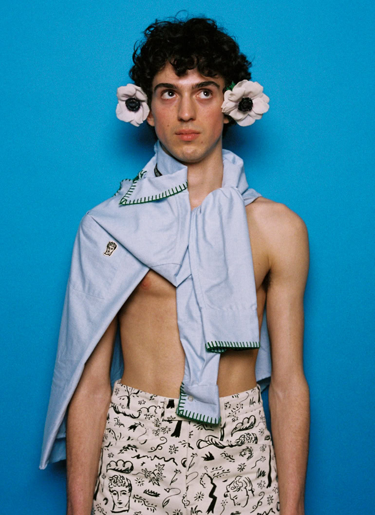 In a similar vein, designer and artist Luke Edward Hall has constructed a whole world – interior design, illustration, fashion – around queering old English classics. Taking cues from the likes of David Hockney and the countryside, he camps up traditional shapes and materials through choice accessories. A glittery shirt, an “outrageous tie” or a handmade ceramic brooch teamed with a tweed blazer is one such example he gives from his own personal style. Hall channels this sensibility into his label, Chateau Orlando. The SS25 collection – titled Blossom at the Mention of Your Name after Fiona Cooper’s 1995 gay love story – offered deckchair-striped linen shirts and blanket-stitched shorts, ideal for a picnic in the Cotswolds, where Hall resides. “Prep can be eccentric and unique. One just has to make it their own,” he says. “I have to have fun, and there has to be tension in my style. For me, this tension is created when unusual colours and references are thrown together.”