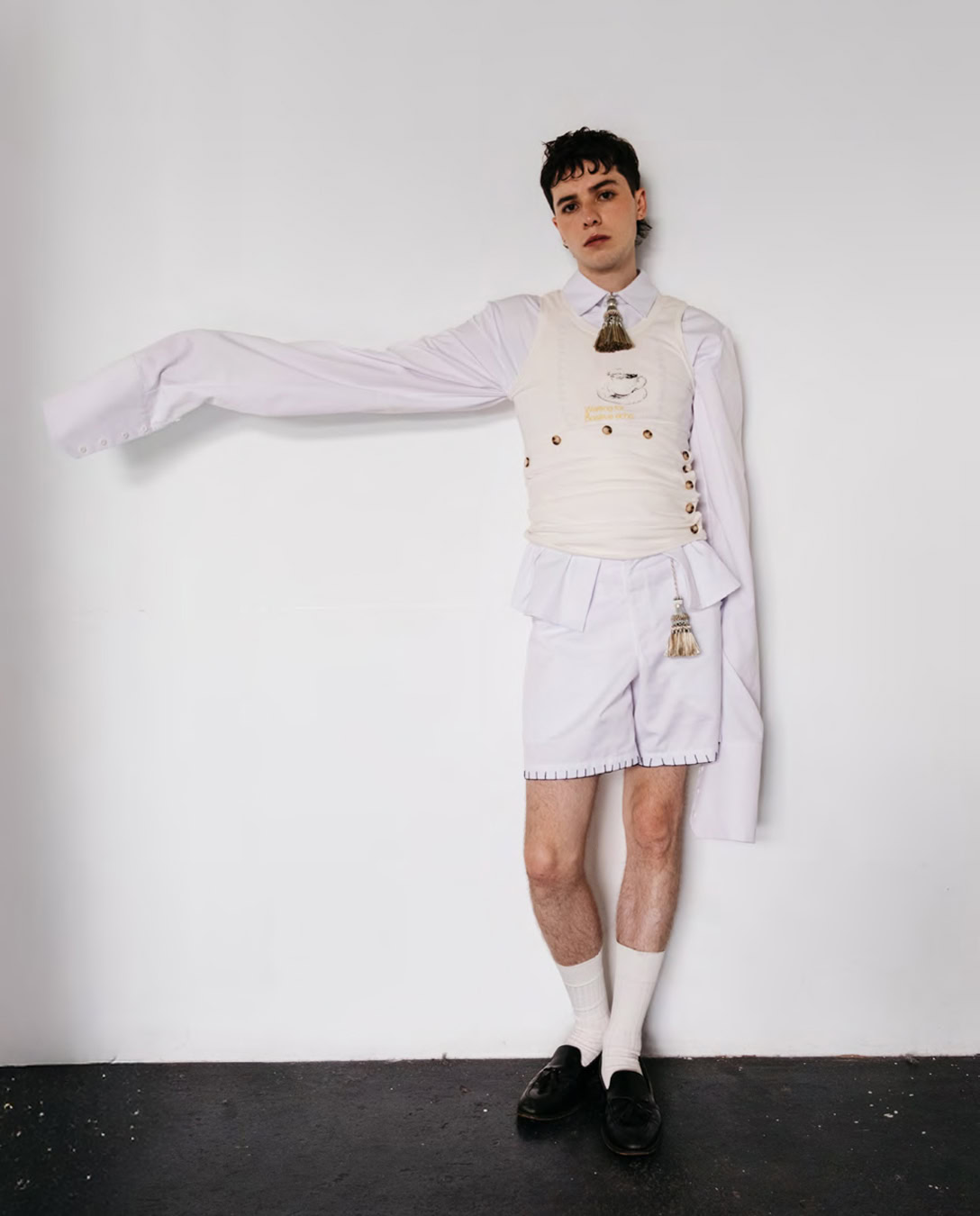 Geordie Campbell, an emerging designer raised in Oxfordshire, itself an epicentre of preppies, has built his brand with prep as an integral part. Polo collars are layered atop one another, a corduroy suit comes with a rosette and a dress shirt is fastened with a white ribbon akin to those worn at matriculation ceremonies. Campbell even entitled his AW25 collection Michaelmas after the academic September-to-Christmas term. “I find school uniform really amusing – kids dressed as adults in blazers and ties,” he says. “I like playing with that idea but in reverse. It’s mutton dressed as lamb. Grown men in little boy shorts. It seems so wrong, but it just looks so fab.” Certainly, there’s some wilful appropriation at play. In SS26, conventionally boyish designs were, once more, approached with a wistful, soft gaze, incorporating, for example, a damask curtain fabric and a double placket. “I think when you grow up queer, you often grow up a lot faster,” he says. “So this preppiness comes from a certain craving for nostalgia, to relive your innocence and youth.”