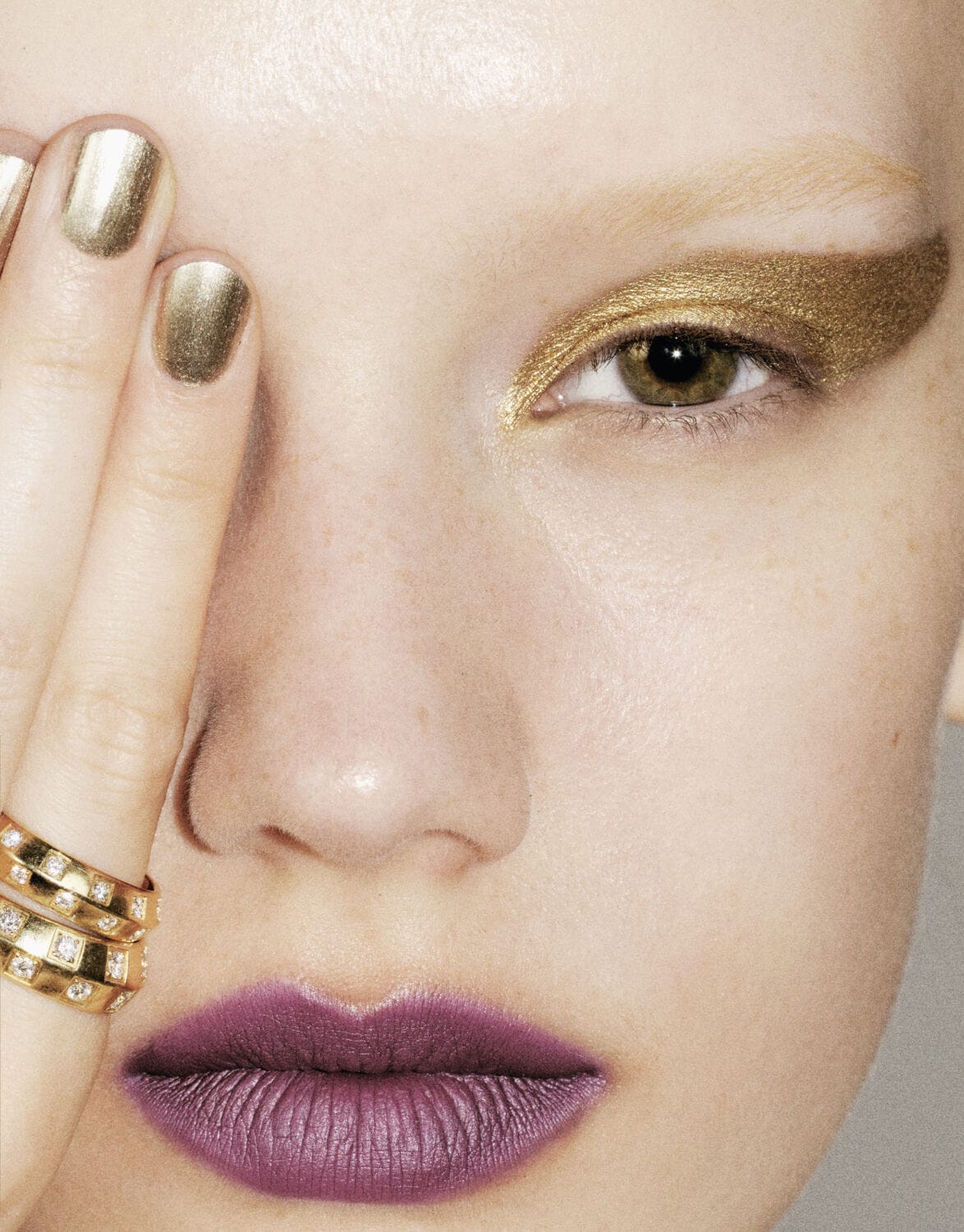 from left: LV Ombres eyeshadow palettes in Force of Nature 951 and Waking Dawn 650, LV Rouge lipstick in Sables Roses 111 by LA BEAUTE LOUIS VUITTON, Le Damier de Louis Vuitton rings in yellow gold and diamonds by LOUIS VUITTON Fine Jewellery