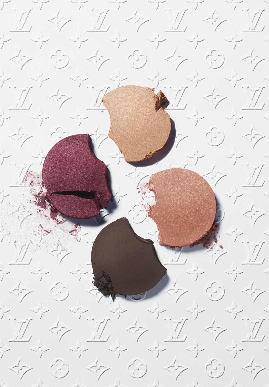from left: LV Ombres eyeshadow palettes in Cosmic Dreams 450 and Dazzling Gaze 350, LV Rouge lipstick in Nebula Plum 400 by LA BEAUTE LOUIS VUITTON and Puffygram earrings by LOUIS VUITTON; LV Rouge lipstick in Legendary 503 by LA BEAUTE LOUIS VUITTON