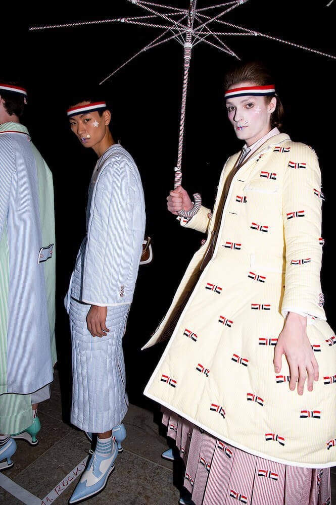 At the beginning of the show: fun! When a tutu-wearing ballet dancer James Whiteside (of American Ballet Theatre) unzipped models (who were stood on plinths) and wearing fancy zip-bags (the kind you keep in your wardrobe) to reveal exquisite cotton Seersucker shorts suits in pastels and a delicious lemon. It was bizarre and beautiful. In the centre of the runway a Manekken Pis – the 61 cm bronze sculpture and tourist must-see in the centre of Brussels. Brown rendered his version in a material tape. Tennis balls in tape surrounded the statue. It was a cheeky allegory for the “sportswear codes meets high art and culture” inspiration behind this master-tailor’s mood next spring. Such brilliant fun.