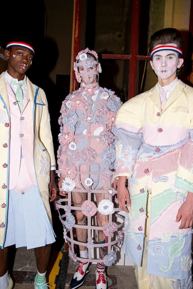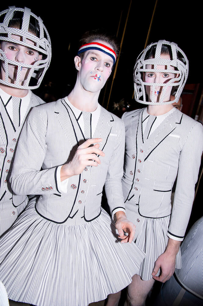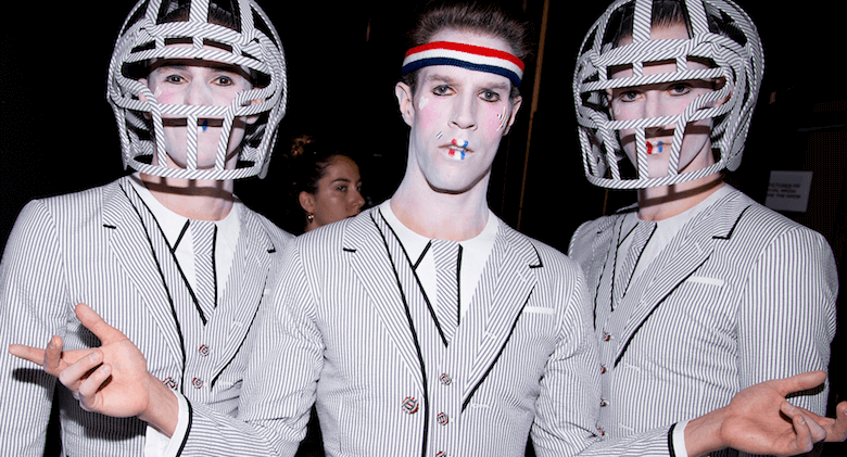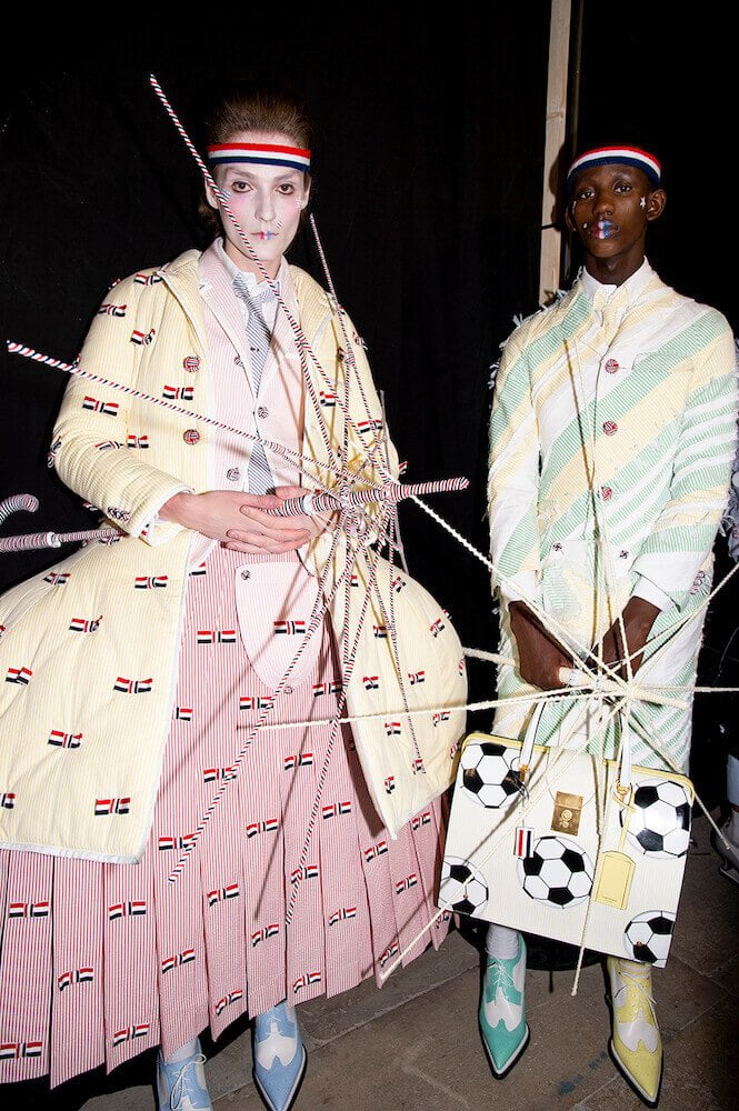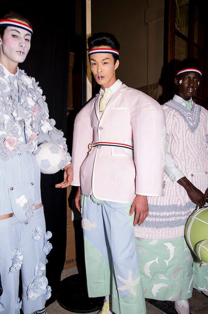 The collegiate worlds of various sports collided with the exquisite world of ballet at the Thom Browne SS20 show. Set in the École nationale supérieure des Beaux-Arts: the home of fine arts teaching in Paris; it was a beautiful backdrop for Thom Browne’s clever blend of sportswear-flexed line-out. This included the shoulder pads of American footballers (in jackets and coats), their masks, too, broken down and abstracted; even the lace-up football became a bum bag. The ovoid shape became padding on elbows and elsewhere on one beautifully crafted coat, too.
