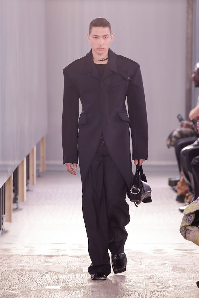 Since 1911, Trussardi has specialised in leather goods, making it one of the oldest fashion houses still showing today. Erasing the hierarchical standards fashion has become so familiar with, the duo tackled signature Italian silhouettes, altering the status quo with each democratic low-waist trouser, holey knit and genderless coat-gown hybrid of the 40-look lineup.