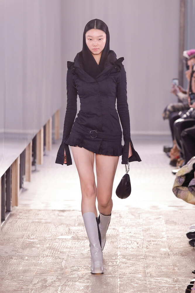 The co-ed cast stomped through the Palazzo wreckage clad in newfangled piumino jackets, swathed in sensual boned-corsetry and donning broad-shoulder leather coats. Elsewhere, Isik and Huseby built armour-like shearlings inspired by Mediaeval and Renaissance dress and lined slick minis with bold bustles – all in black, white, and grey.