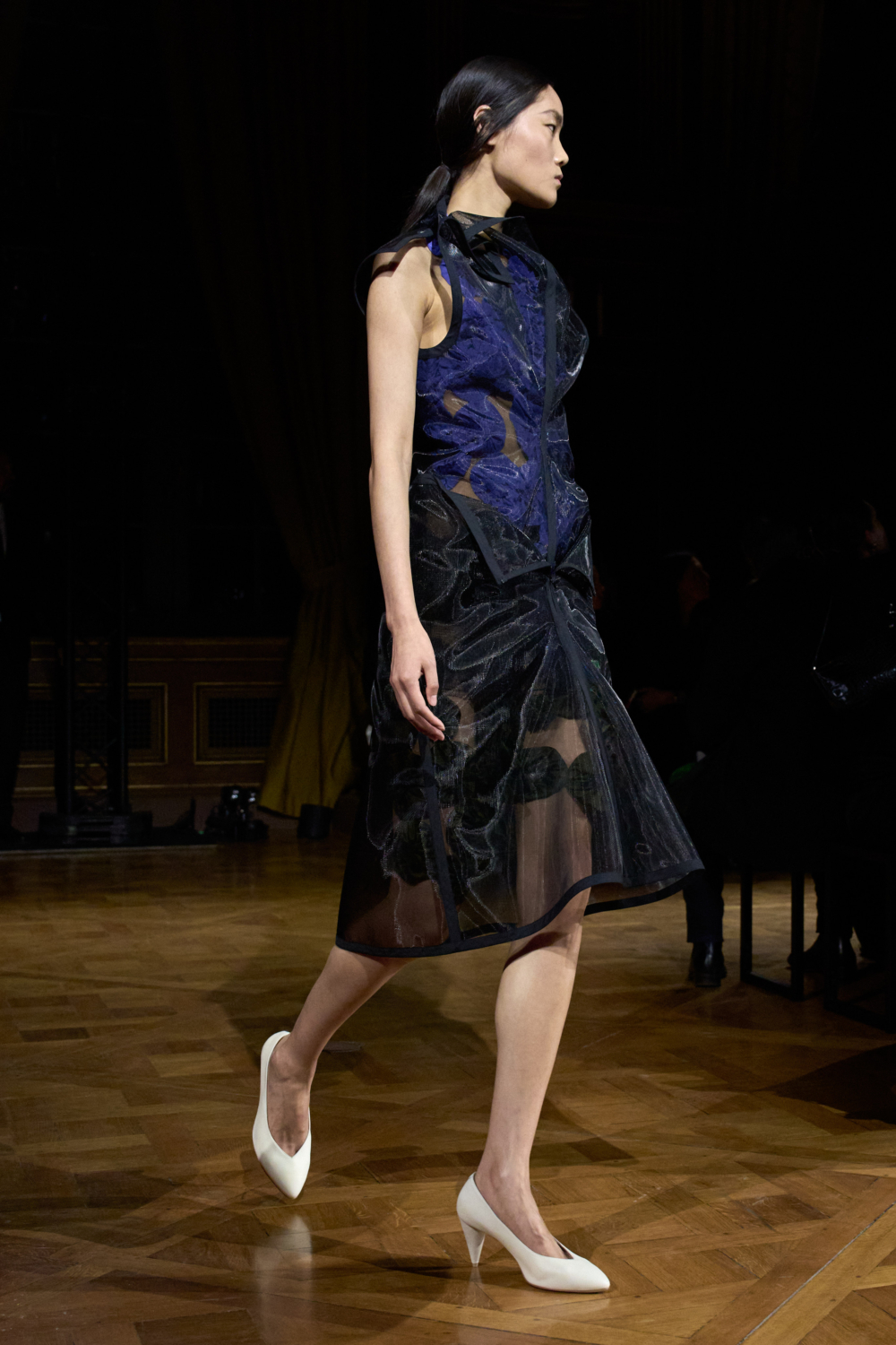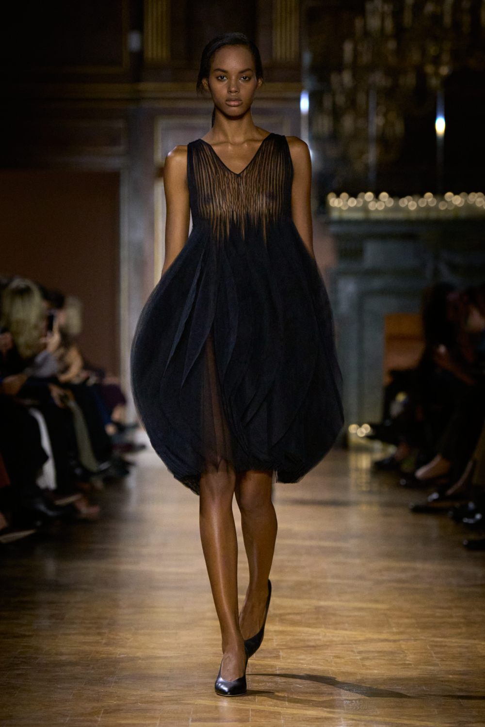 Evening built gently rather than theatrically: velvet dresses with geometric necklines, organza styles with puffed skirts and mille-feuille layers that fluttered as they moved. Clean lines, strong shoulders and a clear sense of control – very much Beckham’s idea of modern power dressing.