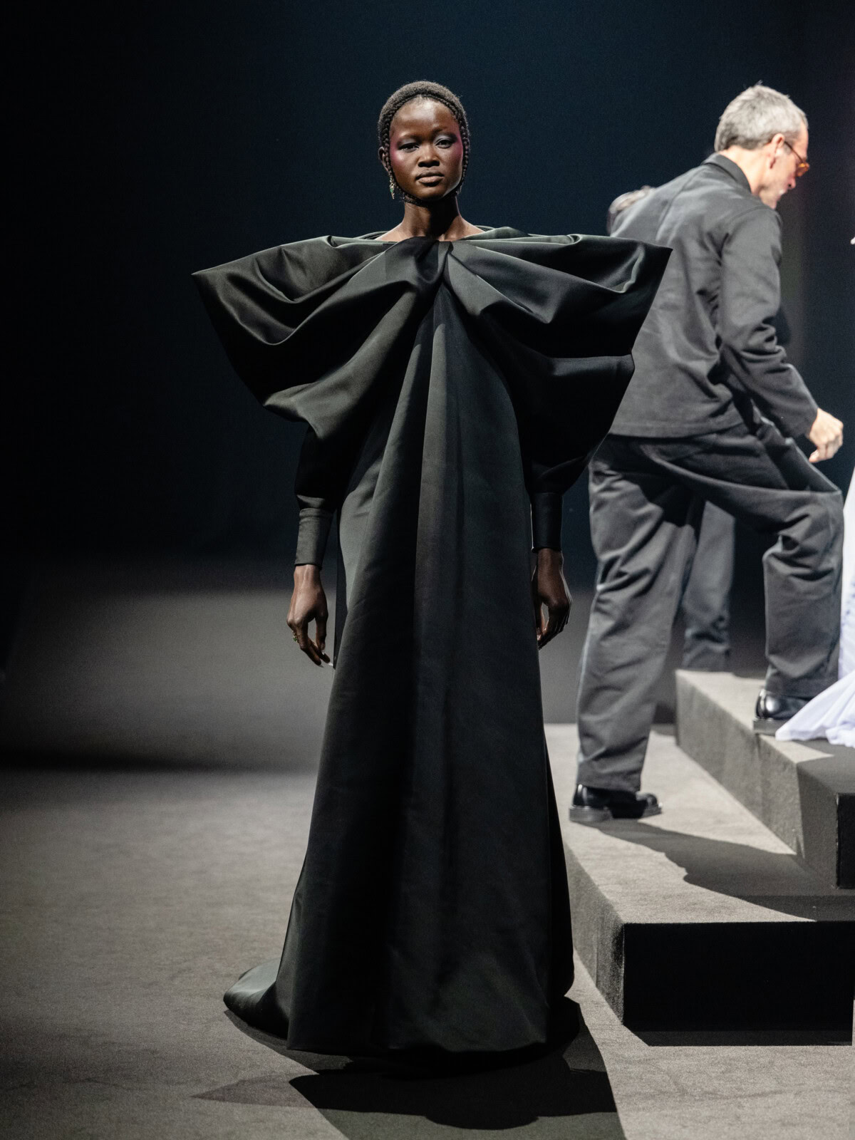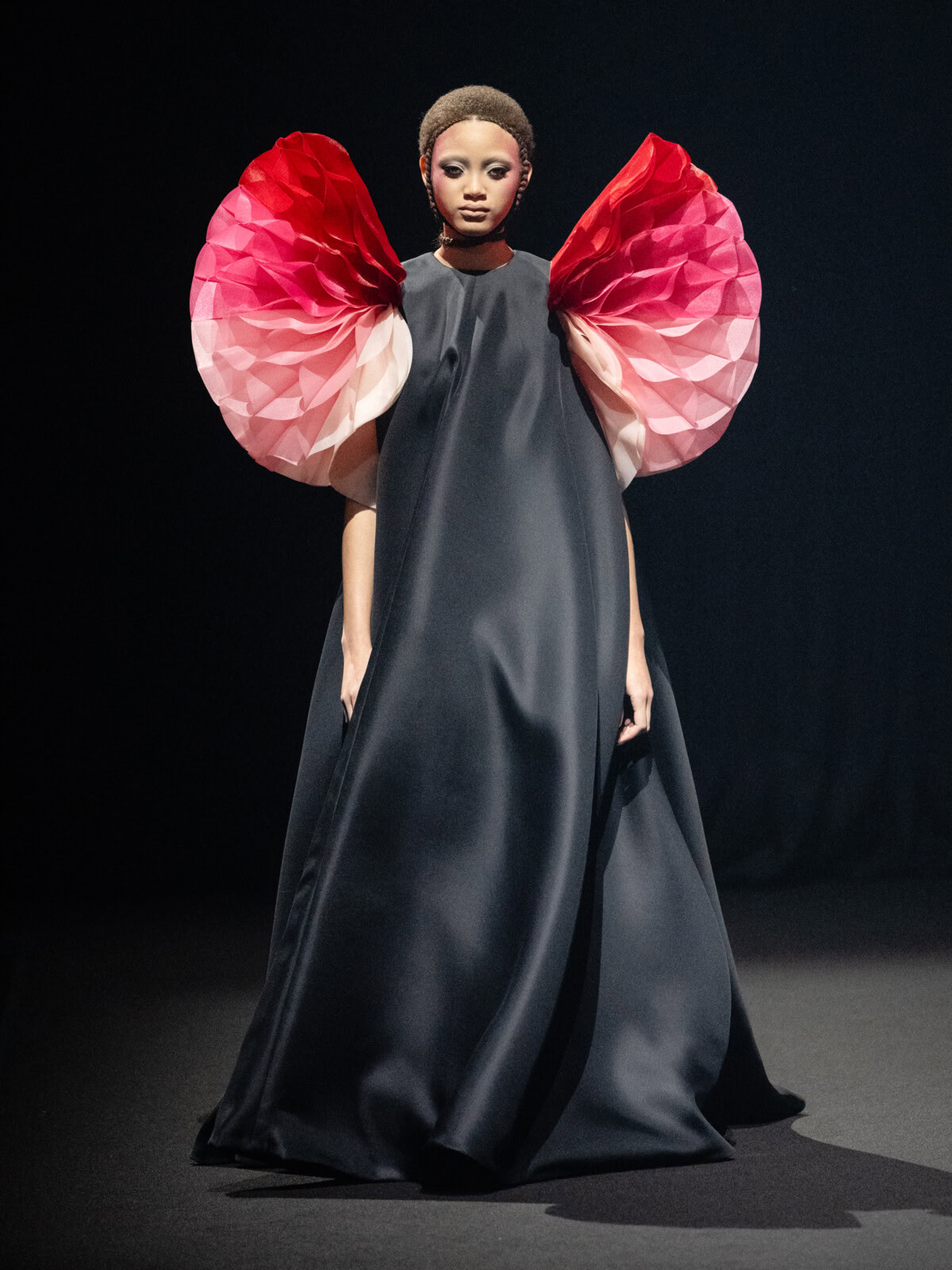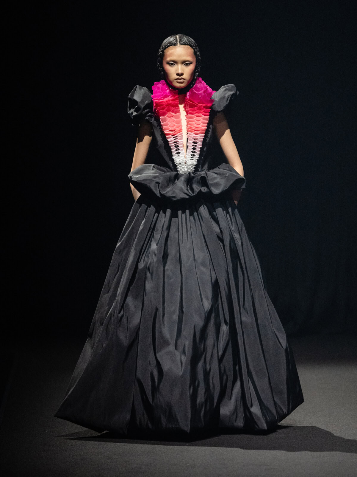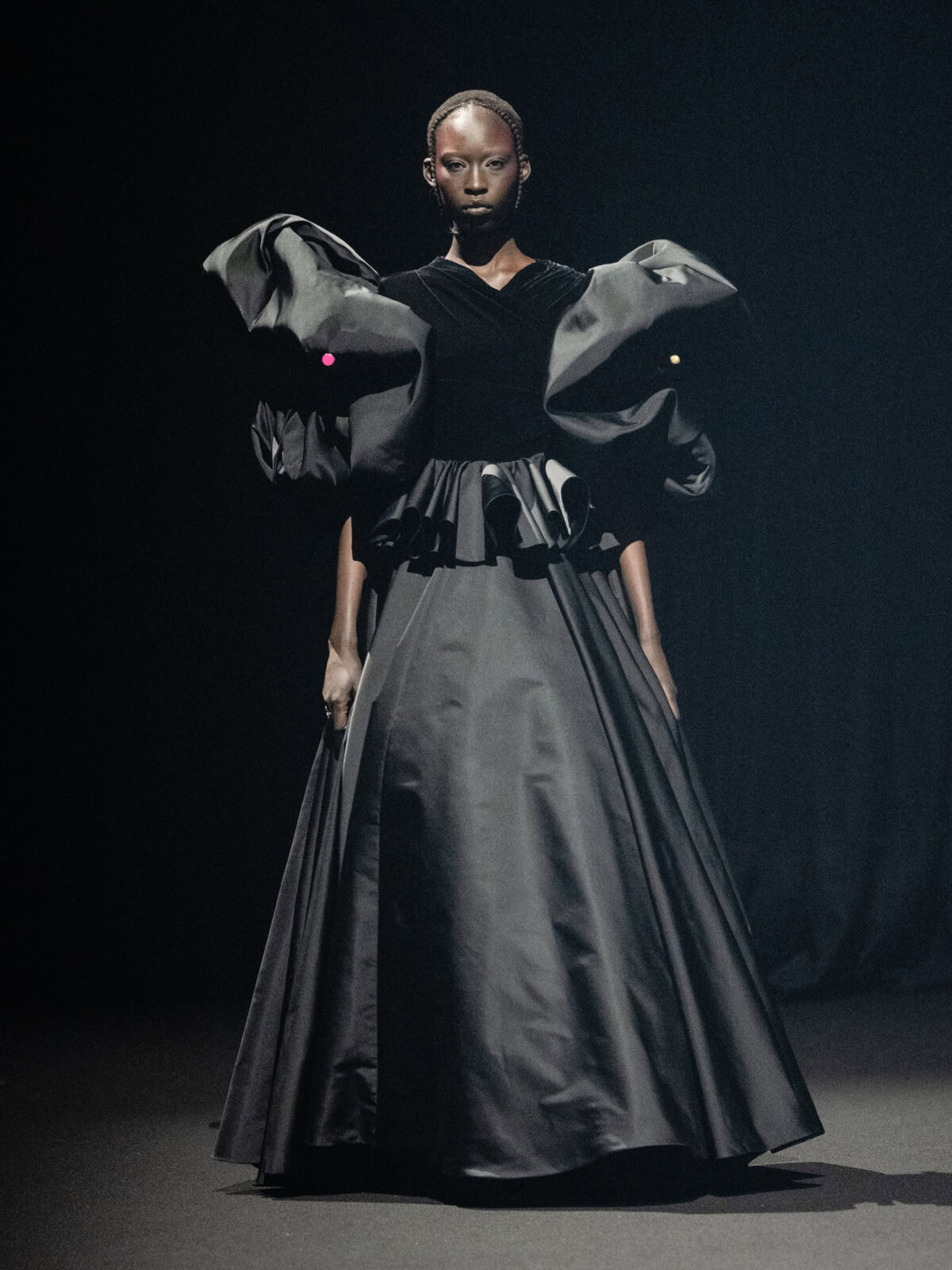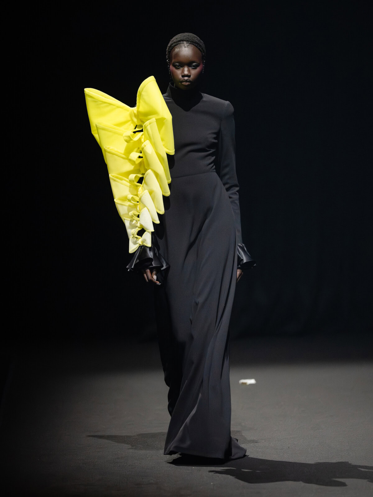 At Viktor & Rolf’s awe-inspiring SS26 couture show, the Dutch design duo quite literally built their final look in front of the fash pack – taking a single element from each look before it and applying it to a wondrously colourful, flying kite dress. Each preceding ensemble was jet black, zeroing in on silhouette, material and construction, but featured a single, technicolour attachment such as a collar, a cape, bow, rod or pannier. Then, live and in front of the audience, Viktor Horsting and Rolf Snoeren removed that effervescent element and applied it to the model behind them who was, at first, clad in a high-collar, belted, white minidress. Look after look – blousy gowns, floor-sweeping triangular gowns, structured maxi dresses – she transformed like a butterfly emerging from her cocoon, into a dramatic, show-stopping assemblage of neon hues that formed the shape of a kite – a symbol of cheer and levity. Eventually, she took flight, inciting a riotous chorus of oohs and aahs that cut through the sinister soundtrack like a rainbow might when it emerges through the clouds on a dreary day.