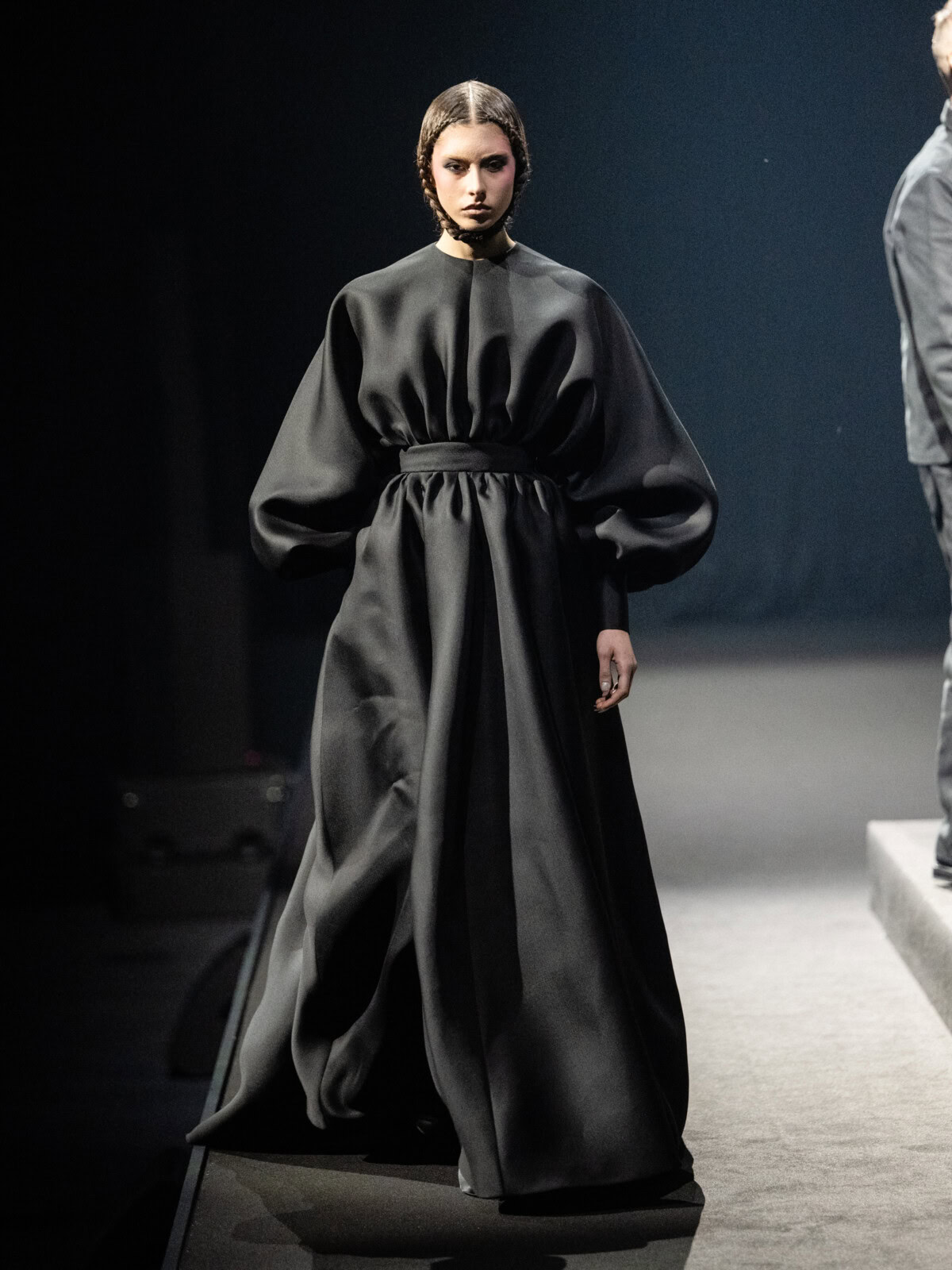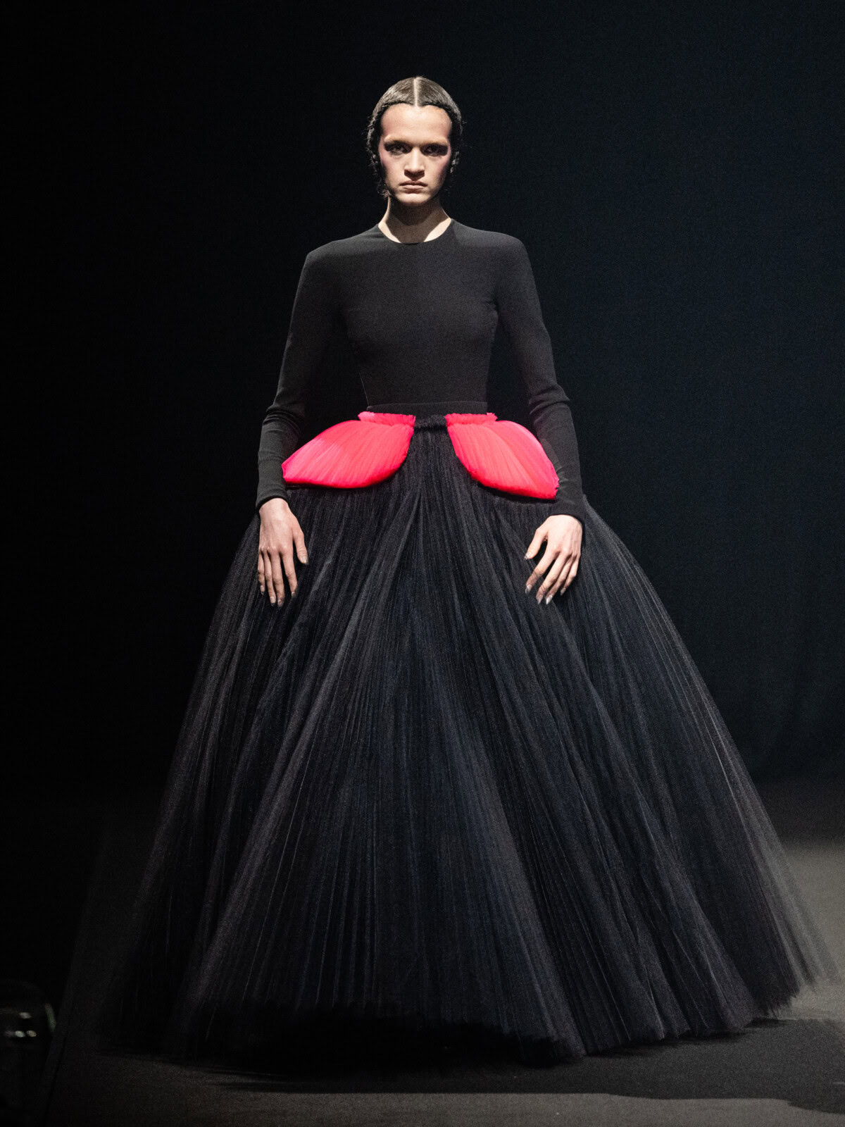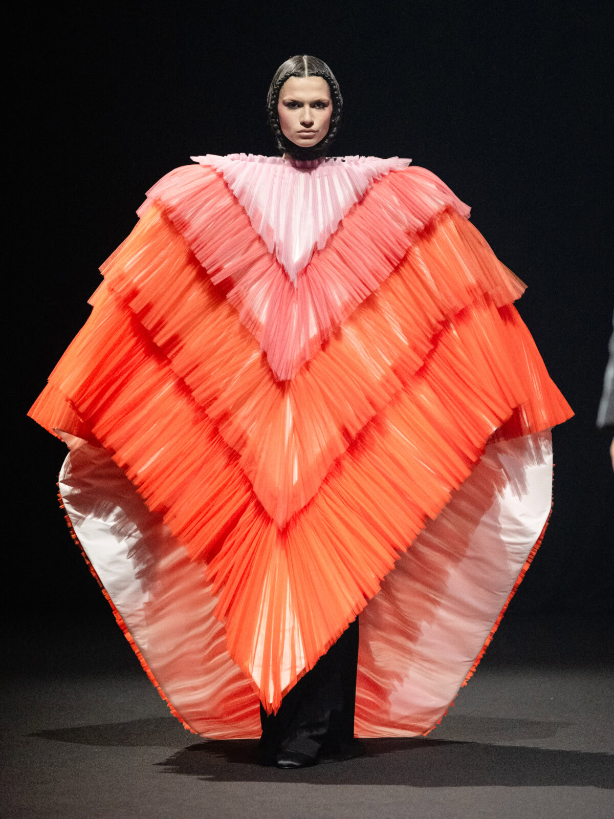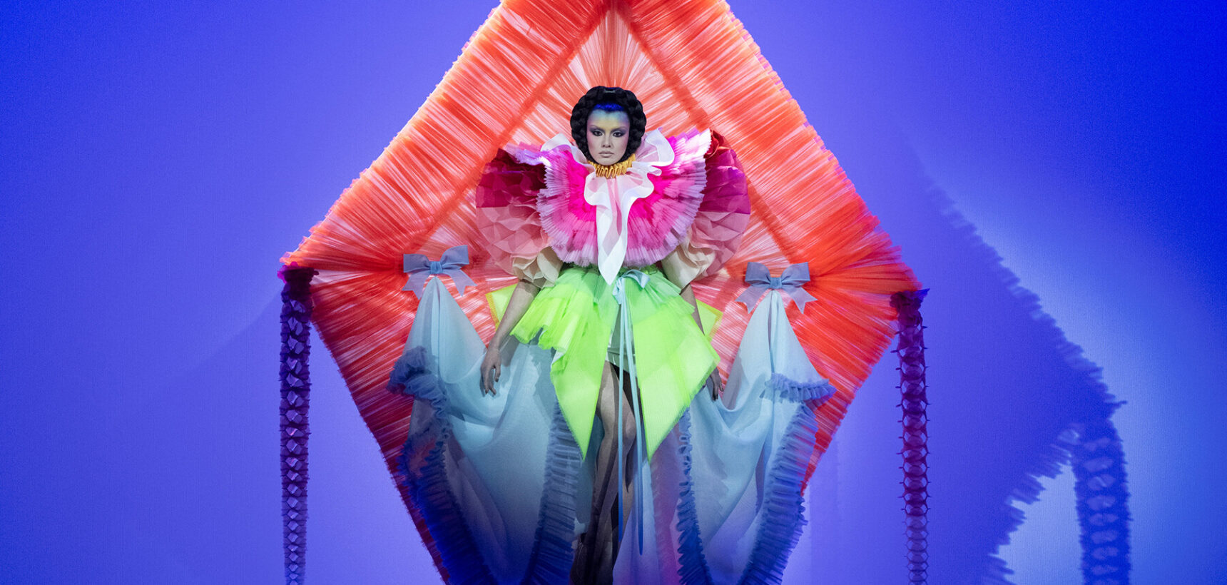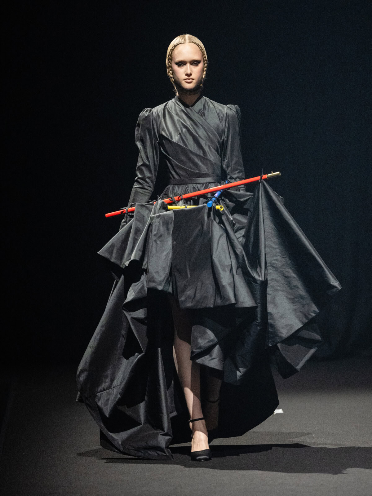 At Viktor & Rolf’s awe-inspiring SS26 couture show, the Dutch design duo quite literally built their final look in front of the fash pack – taking a single element from each look before it and applying it to a wondrously colourful, flying kite dress. Each preceding ensemble was jet black, zeroing in on silhouette, material and construction, but featured a single, technicolour attachment such as a collar, a cape, bow, rod or pannier. Then, live and in front of the audience, Viktor Horsting and Rolf Snoeren removed that effervescent element and applied it to the model behind them who was, at first, clad in a high-collar, belted, white minidress. Look after look – blousy gowns, floor-sweeping triangular gowns, structured maxi dresses – she transformed like a butterfly emerging from her cocoon, into a dramatic, show-stopping assemblage of neon hues that formed the shape of a kite – a symbol of cheer and levity. Eventually, she took flight, inciting a riotous chorus of oohs and aahs that cut through the sinister soundtrack like a rainbow might when it emerges through the clouds on a dreary day.
