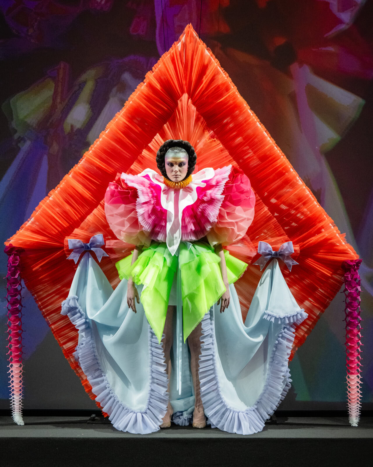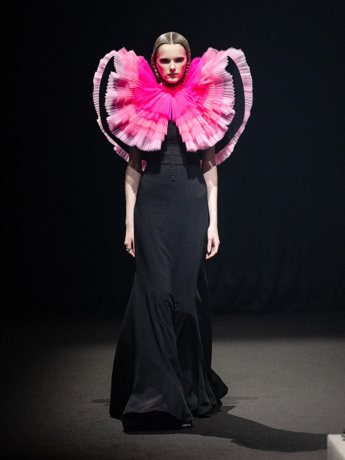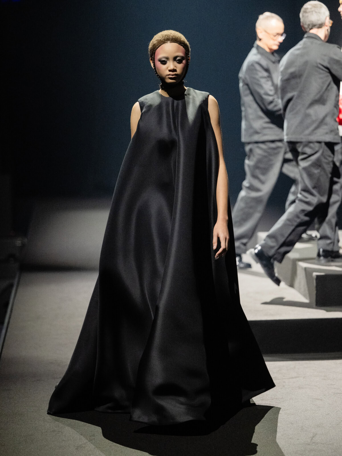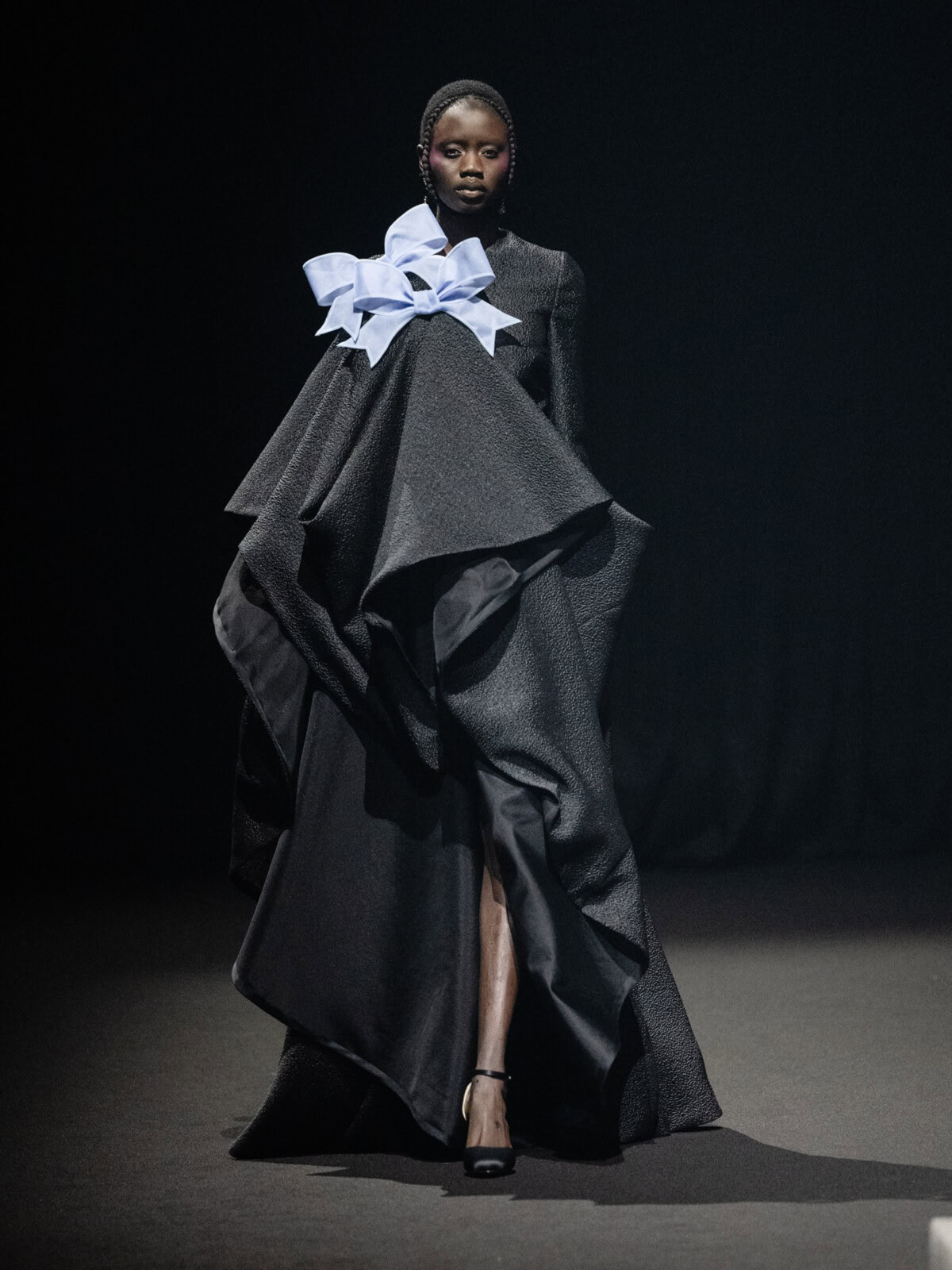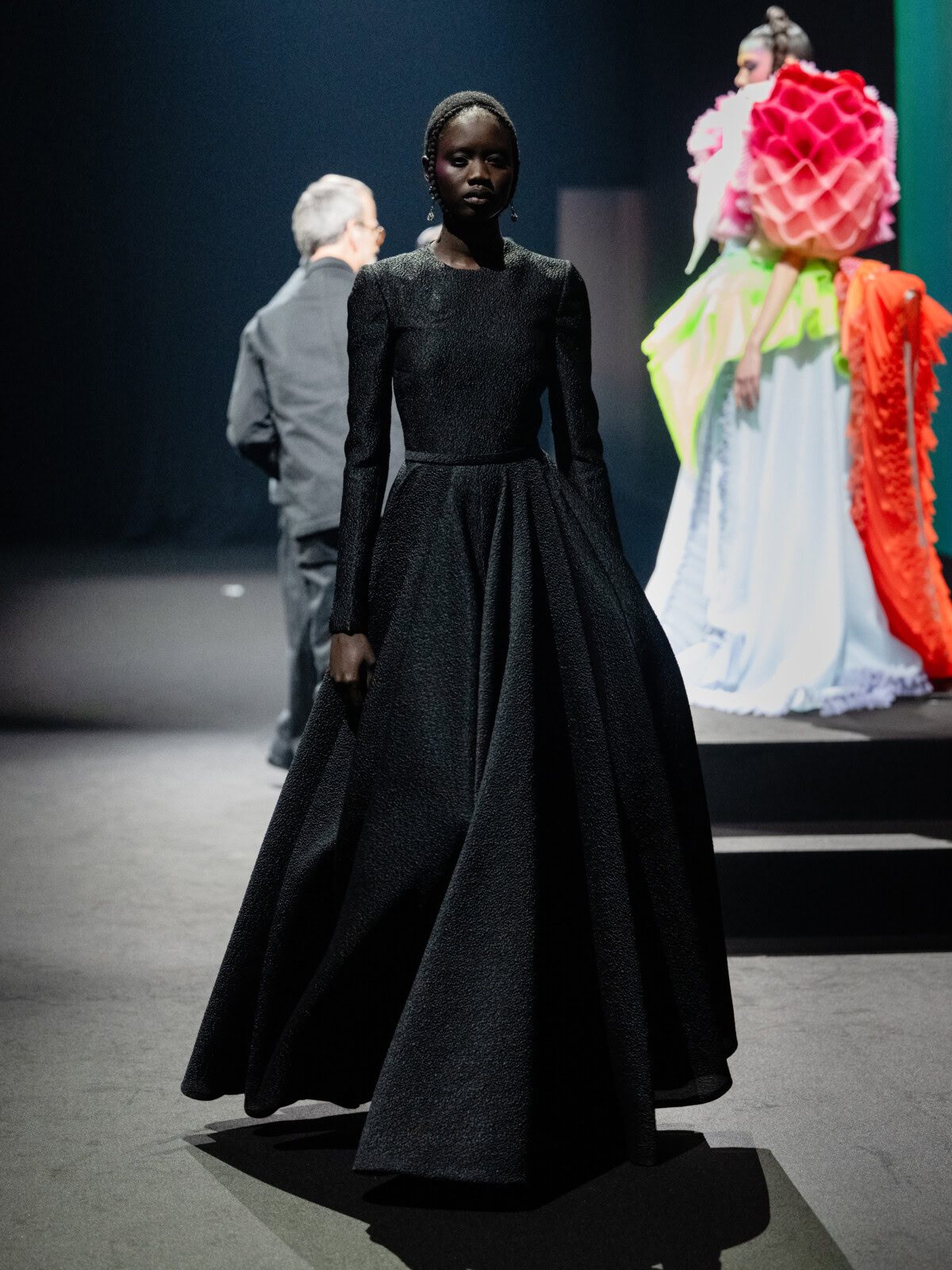 At Viktor & Rolf’s awe-inspiring SS26 couture show, the Dutch design duo quite literally built their final look in front of the fash pack – taking a single element from each look before it and applying it to a wondrously colourful, flying kite dress. Each preceding ensemble was jet black, zeroing in on silhouette, material and construction, but featured a single, technicolour attachment such as a collar, a cape, bow, rod or pannier. Then, live and in front of the audience, Viktor Horsting and Rolf Snoeren removed that effervescent element and applied it to the model behind them who was, at first, clad in a high-collar, belted, white minidress. Look after look – blousy gowns, floor-sweeping triangular gowns, structured maxi dresses – she transformed like a butterfly emerging from her cocoon, into a dramatic, show-stopping assemblage of neon hues that formed the shape of a kite – a symbol of cheer and levity. Eventually, she took flight, inciting a riotous chorus of oohs and aahs that cut through the sinister soundtrack like a rainbow might when it emerges through the clouds on a dreary day.