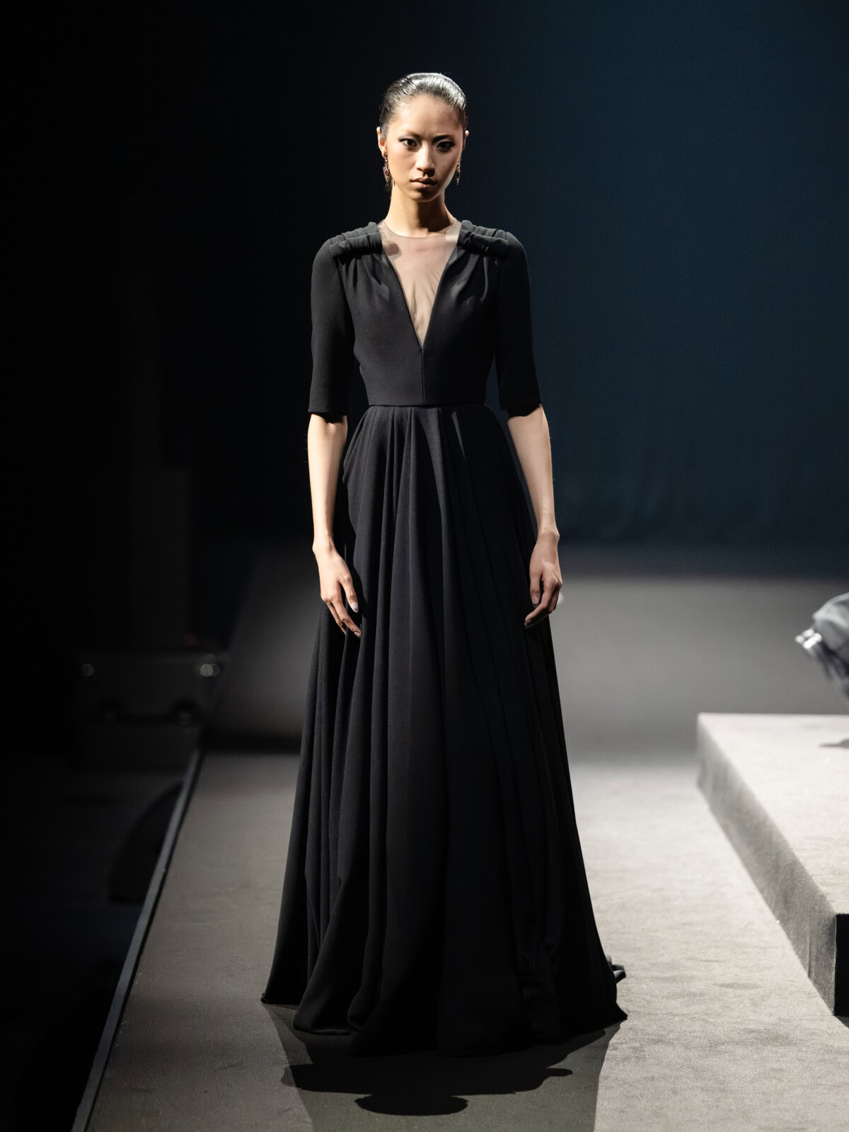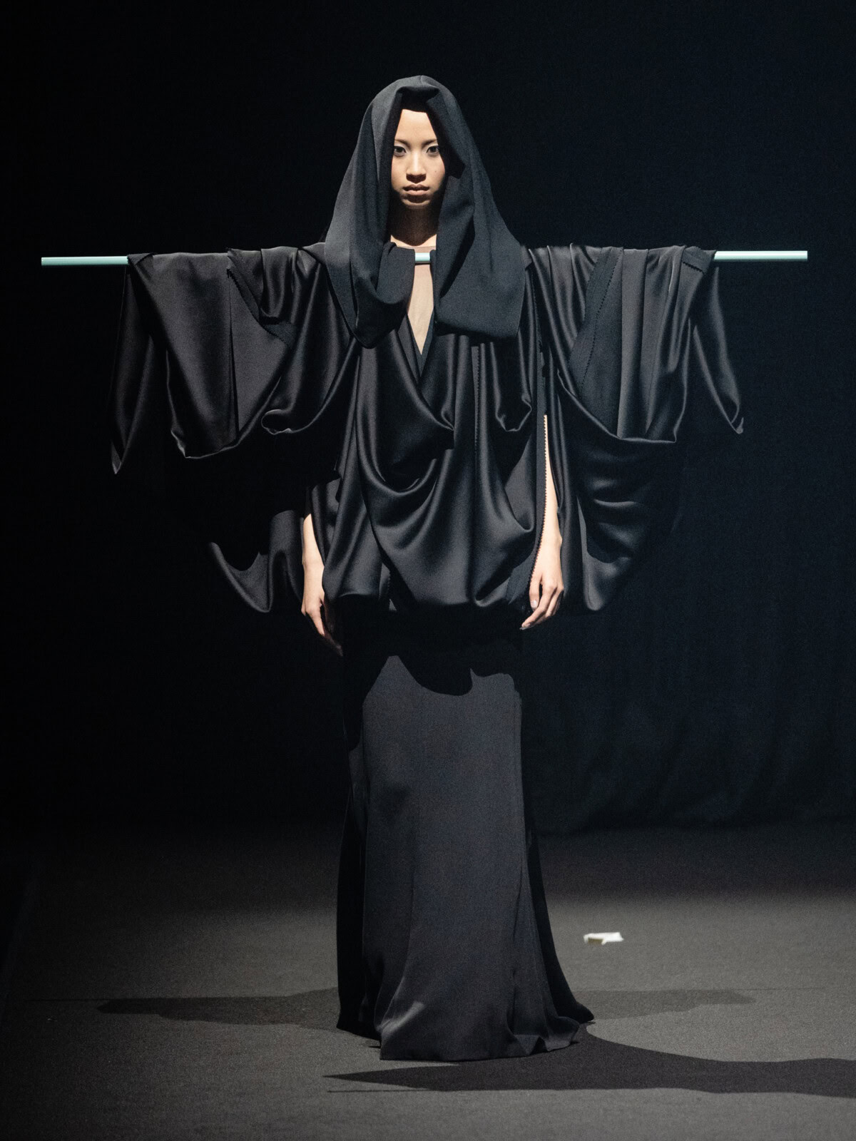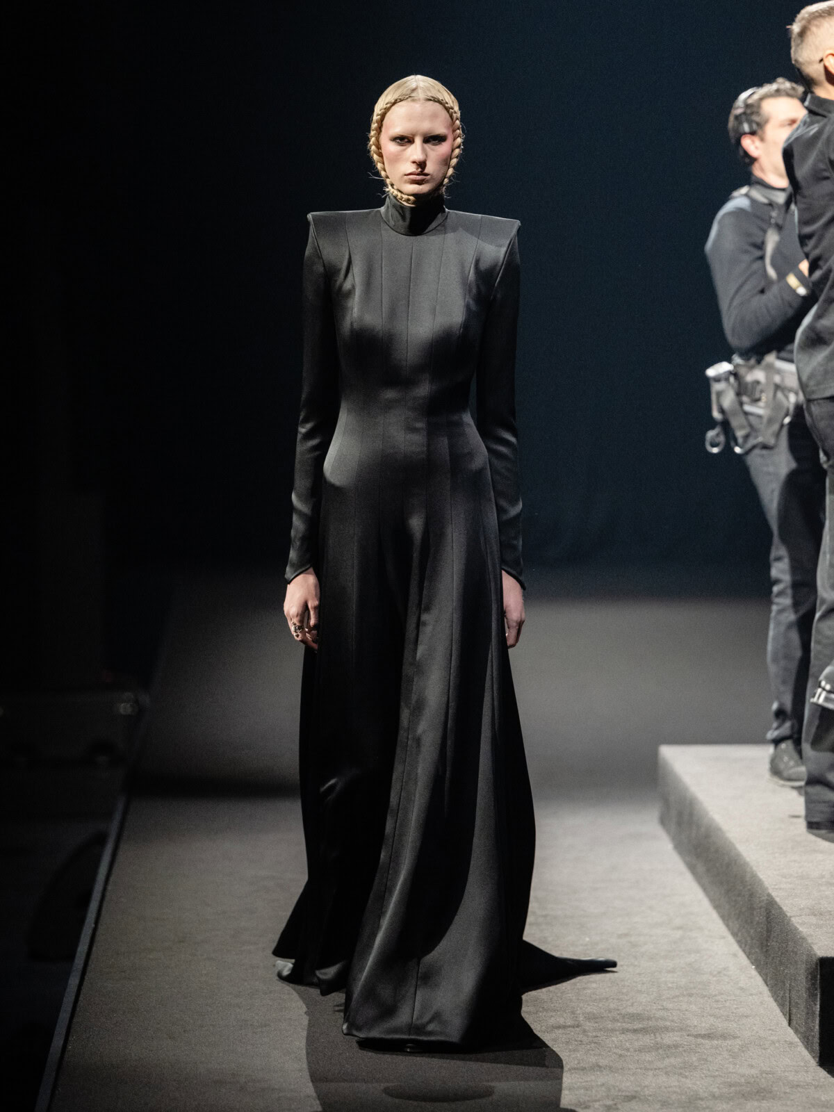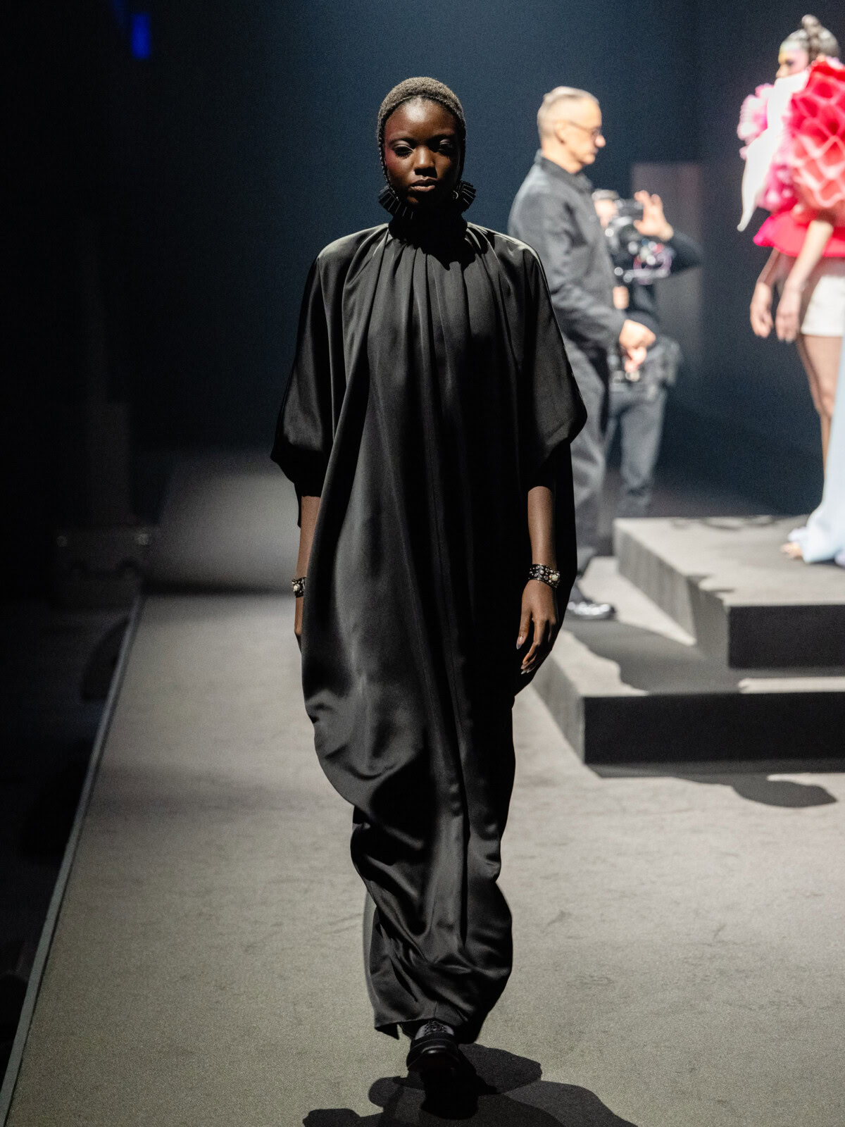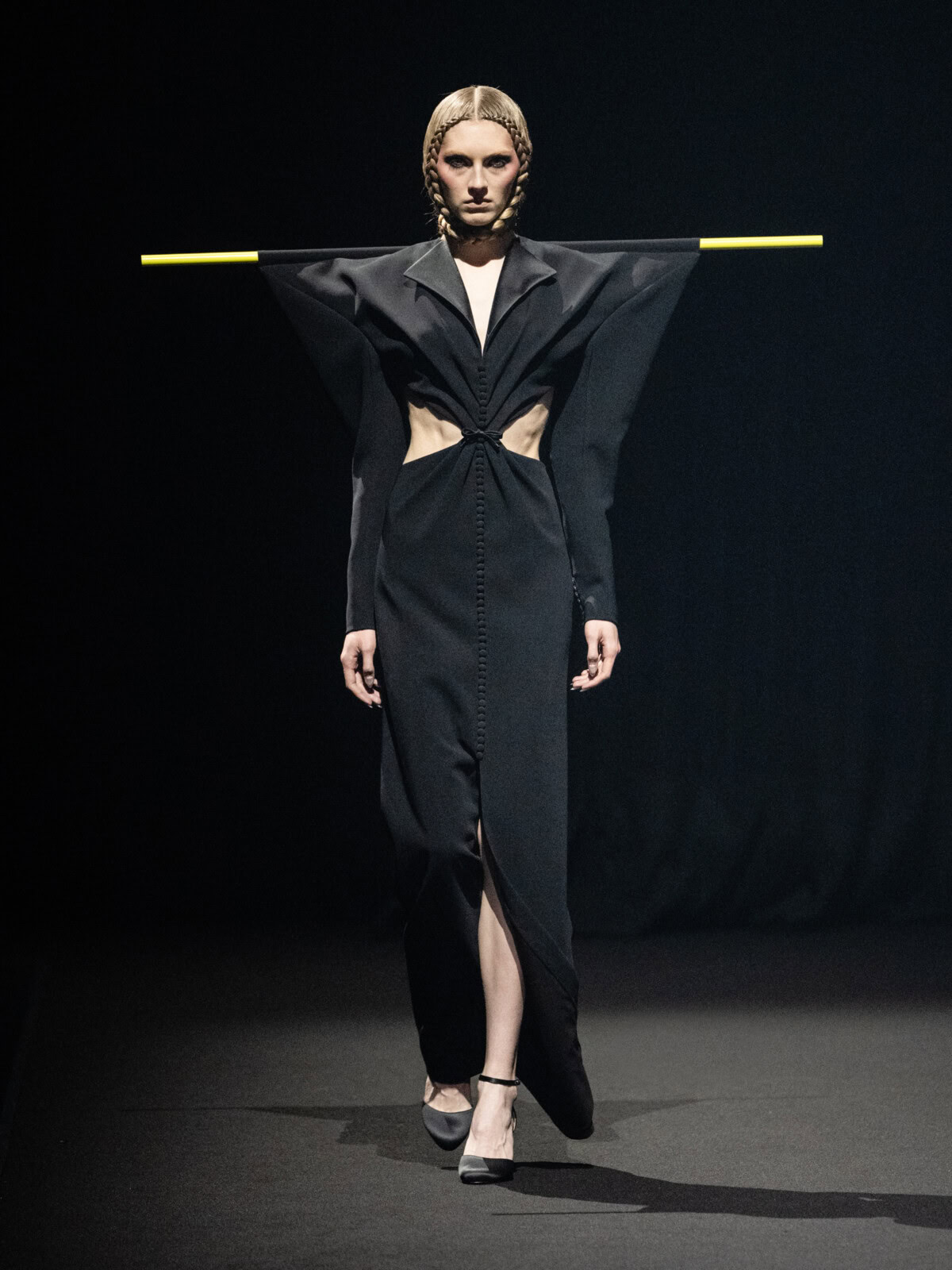 At Viktor & Rolf’s awe-inspiring SS26 couture show, the Dutch design duo quite literally built their final look in front of the fash pack – taking a single element from each look before it and applying it to a wondrously colourful, flying kite dress. Each preceding ensemble was jet black, zeroing in on silhouette, material and construction, but featured a single, technicolour attachment such as a collar, a cape, bow, rod or pannier. Then, live and in front of the audience, Viktor Horsting and Rolf Snoeren removed that effervescent element and applied it to the model behind them who was, at first, clad in a high-collar, belted, white minidress. Look after look – blousy gowns, floor-sweeping triangular gowns, structured maxi dresses – she transformed like a butterfly emerging from her cocoon, into a dramatic, show-stopping assemblage of neon hues that formed the shape of a kite – a symbol of cheer and levity. Eventually, she took flight, inciting a riotous chorus of oohs and aahs that cut through the sinister soundtrack like a rainbow might when it emerges through the clouds on a dreary day.
