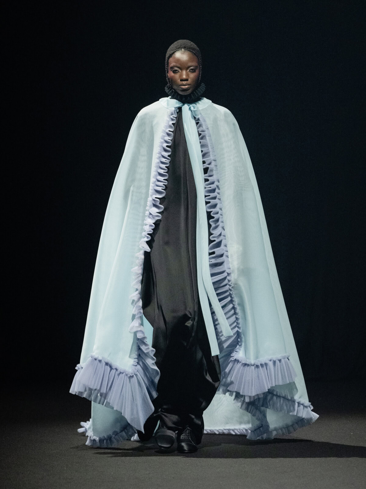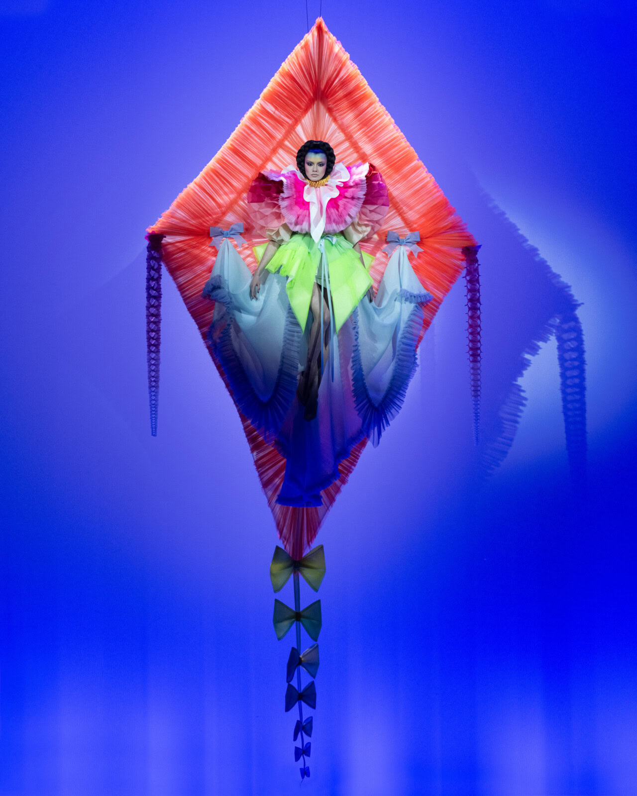 Calling the collection Diamond Kite, the pair set out to reimagine “freedom through the lens of childhood wonder, imagination, and the transformative power of elevation”. They did so effectively, tapping into crayon-like colours and a childlike sense of fantasy. Simultaneously, the kite dress functioned as a tribute to Kate Bush’s The Kick Inside album cover which has inspired the designers since their start more than 30 years ago. Viktor and Rolf have fantasia in their pocket. Watch them soar.