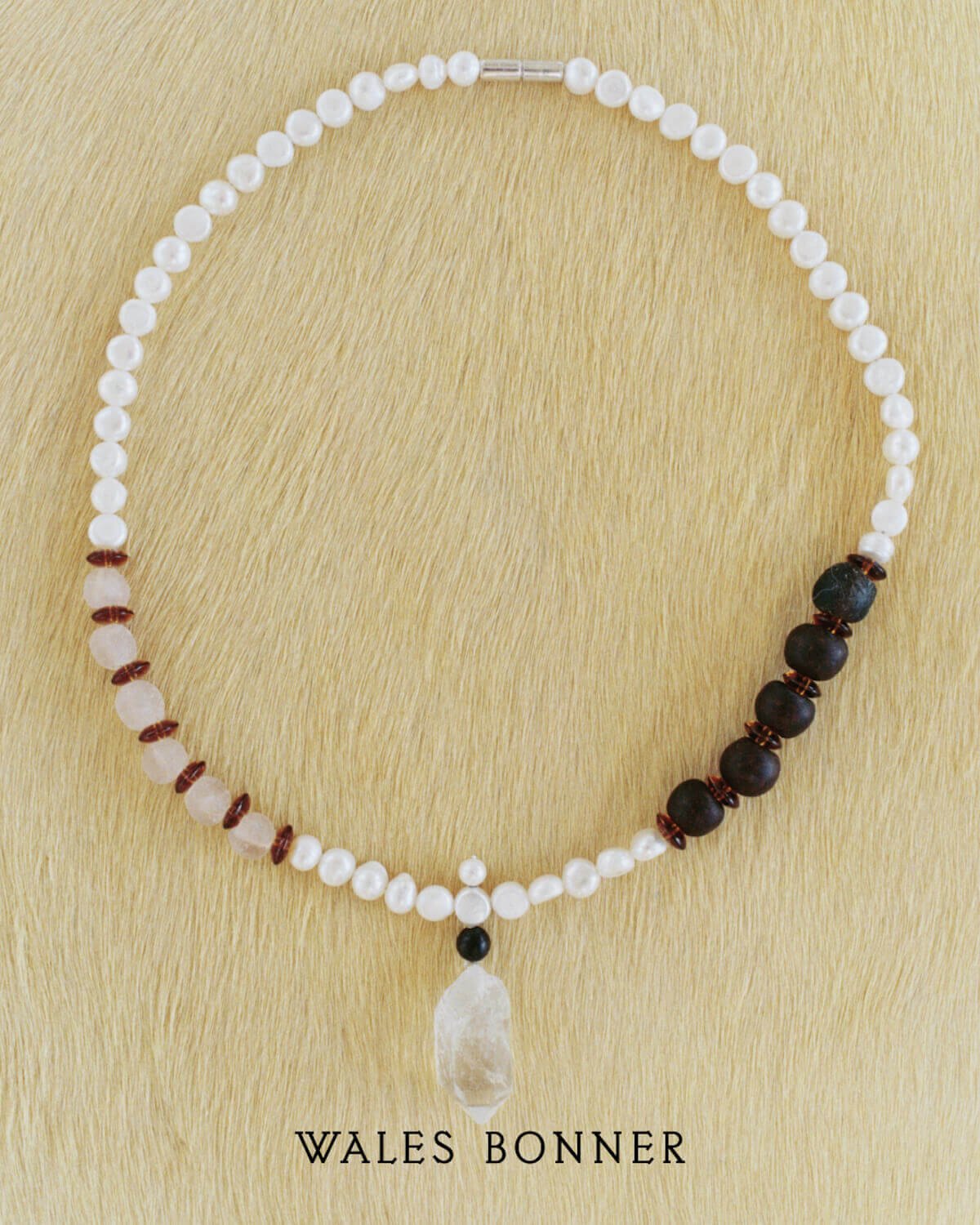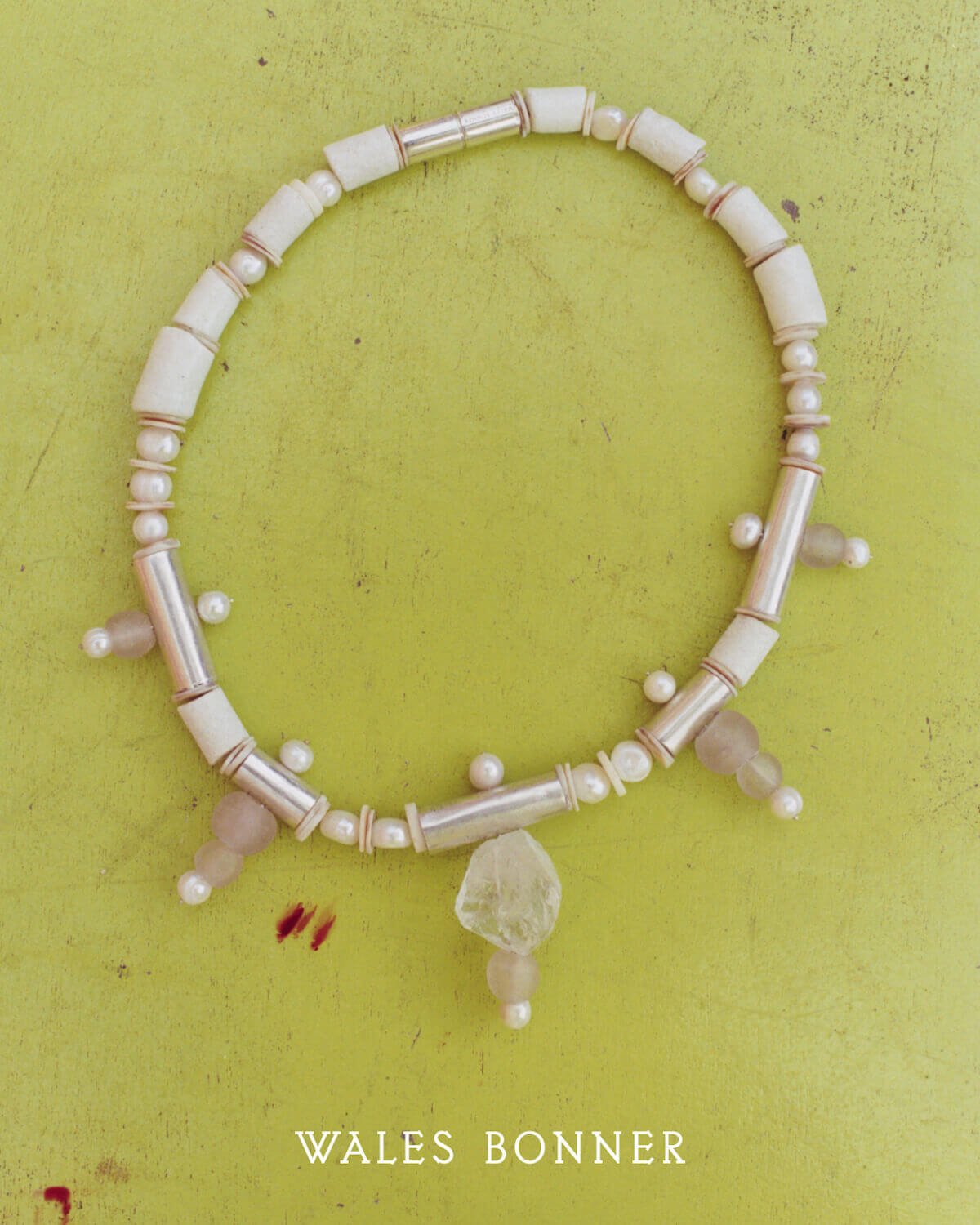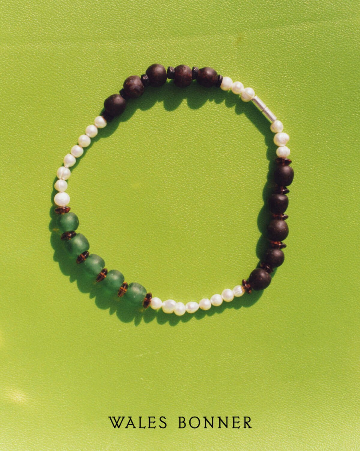 Working with artisans in Krobo, Ghana, the label has worked on a jewellery collection, too. Fashioned from recycled glass beads and eggshell disc beads, custom casted silver and locally sourced freshwater pills, each necklace is completely unique. Quietly elegant, the accessories line marks the next chapter in Wales Bonner’s ascension.