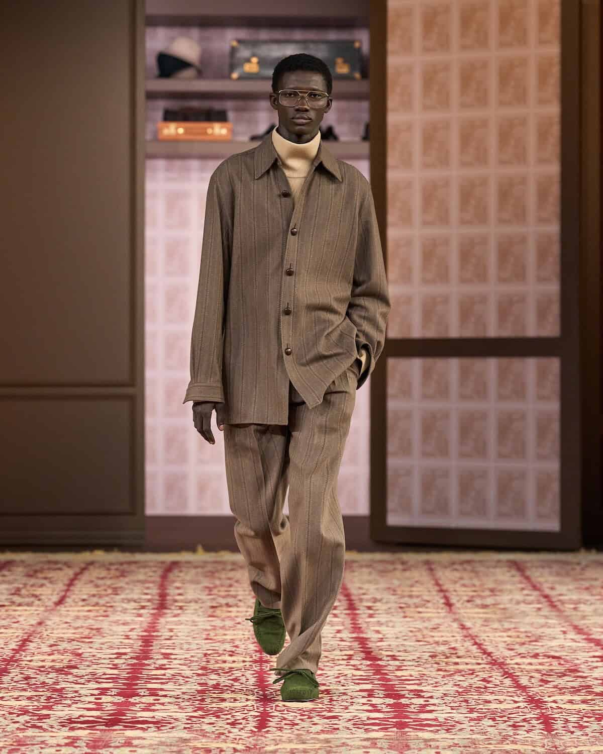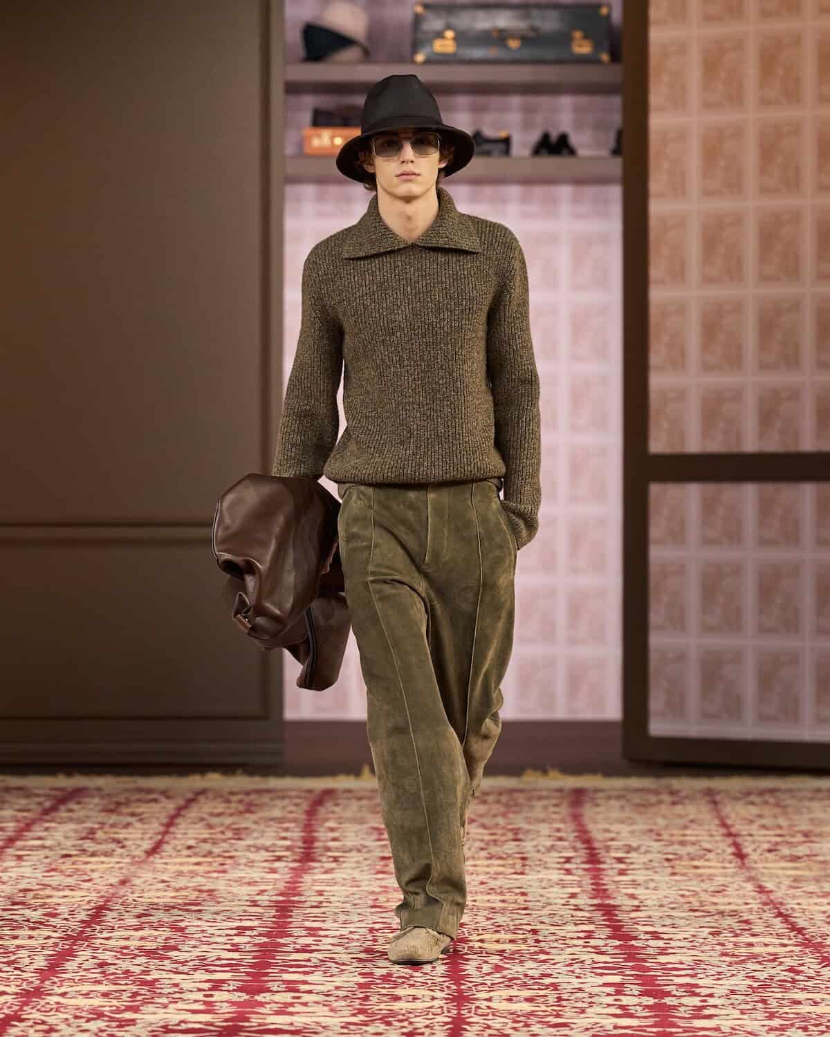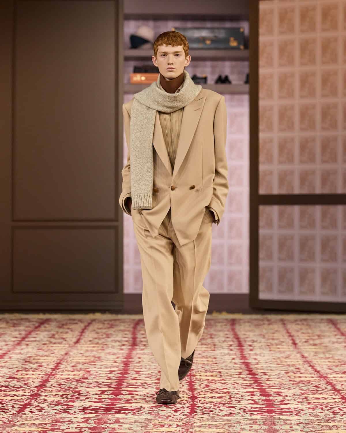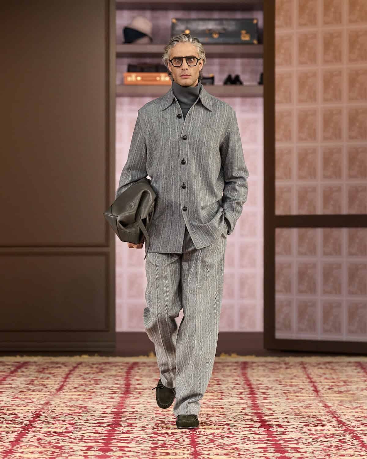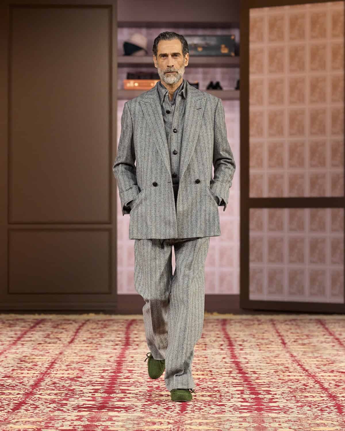 Opening Milan men’s week, the show took place inside a vast space in which Sartori erected a series of “imaginary closets” lined with the actual clothes of third-generational Zegna family members Paolo Zegna and Gildo Zegna. Gildo, also the brand’s group executive chairman, said the wardrobes represent belongings that “are protected from neglect in order for other members of the family to use them. I am after the sense of wonder that happens when one finds a piece that was owned by one’s father, grandfather, uncle; the discovery that comes from studying other ways of dressing, which prompts a willingness to try something new.”